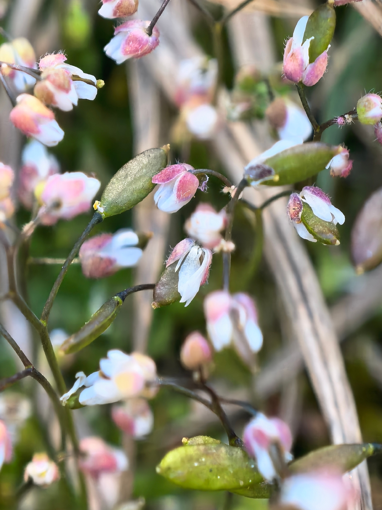 A close-up reveals a cluster of delicate, small flowers with white and pink petals emerging from green seed pods. The flowers and pods are connected to thin, dark stems. In the background, dried grass…read more