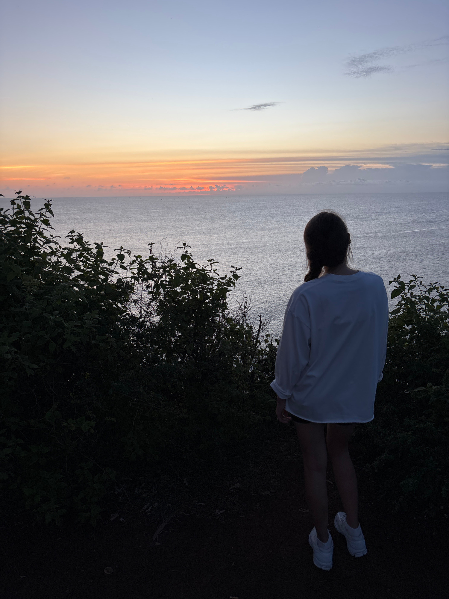 A woman with braided hair stands at the edge of a cliff, overlooking the ocean. She is wearing a white, long-sleeved shirt and white sneakers. The foreground features dark foliage, suggesting a natura…read more