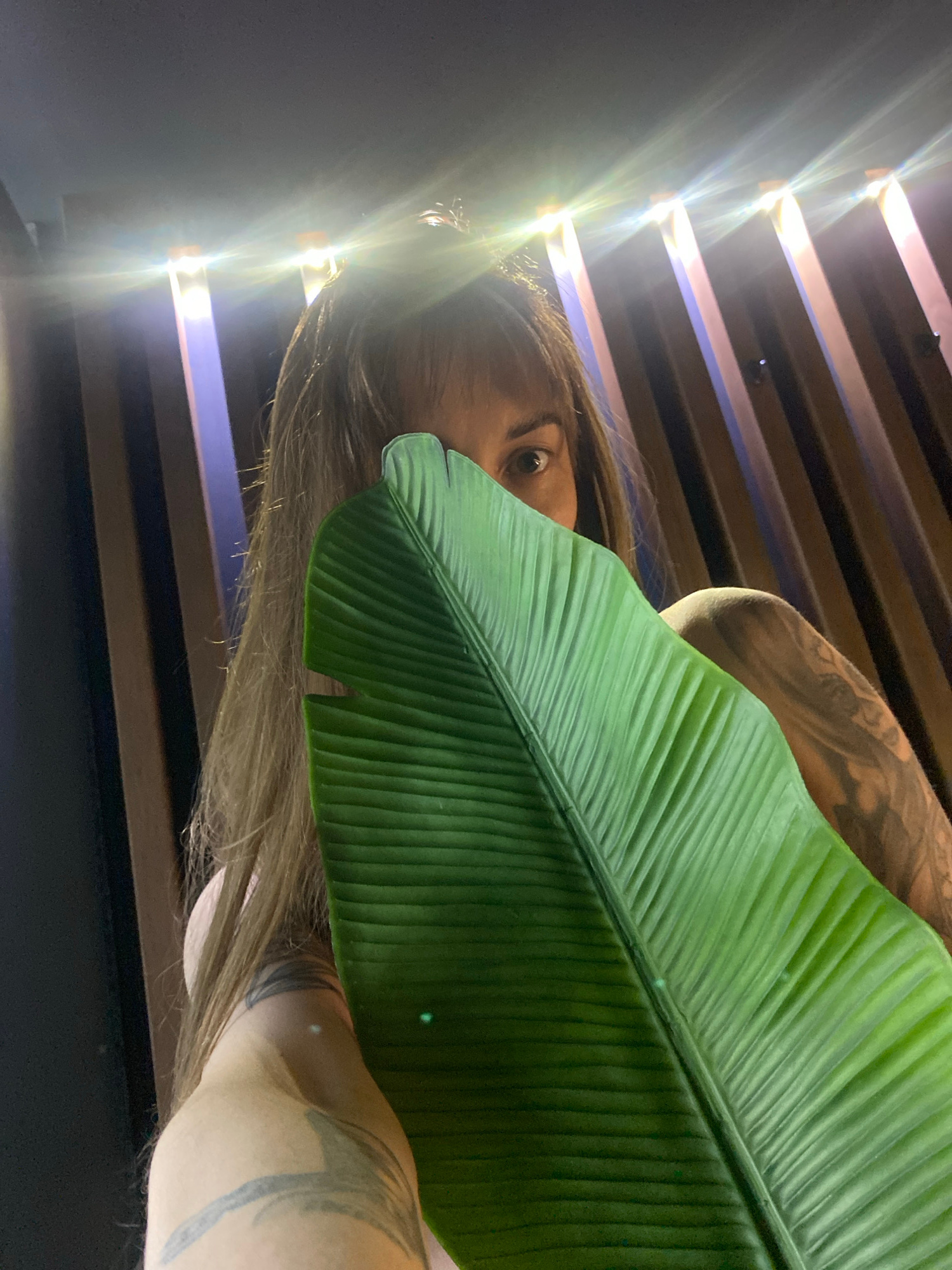 A person is holding a large green leaf in front of their face. Only one eye is visible peeking out from behind the leaf. The person has light brown hair and visible tattoos on their arm. The backgroun…read more