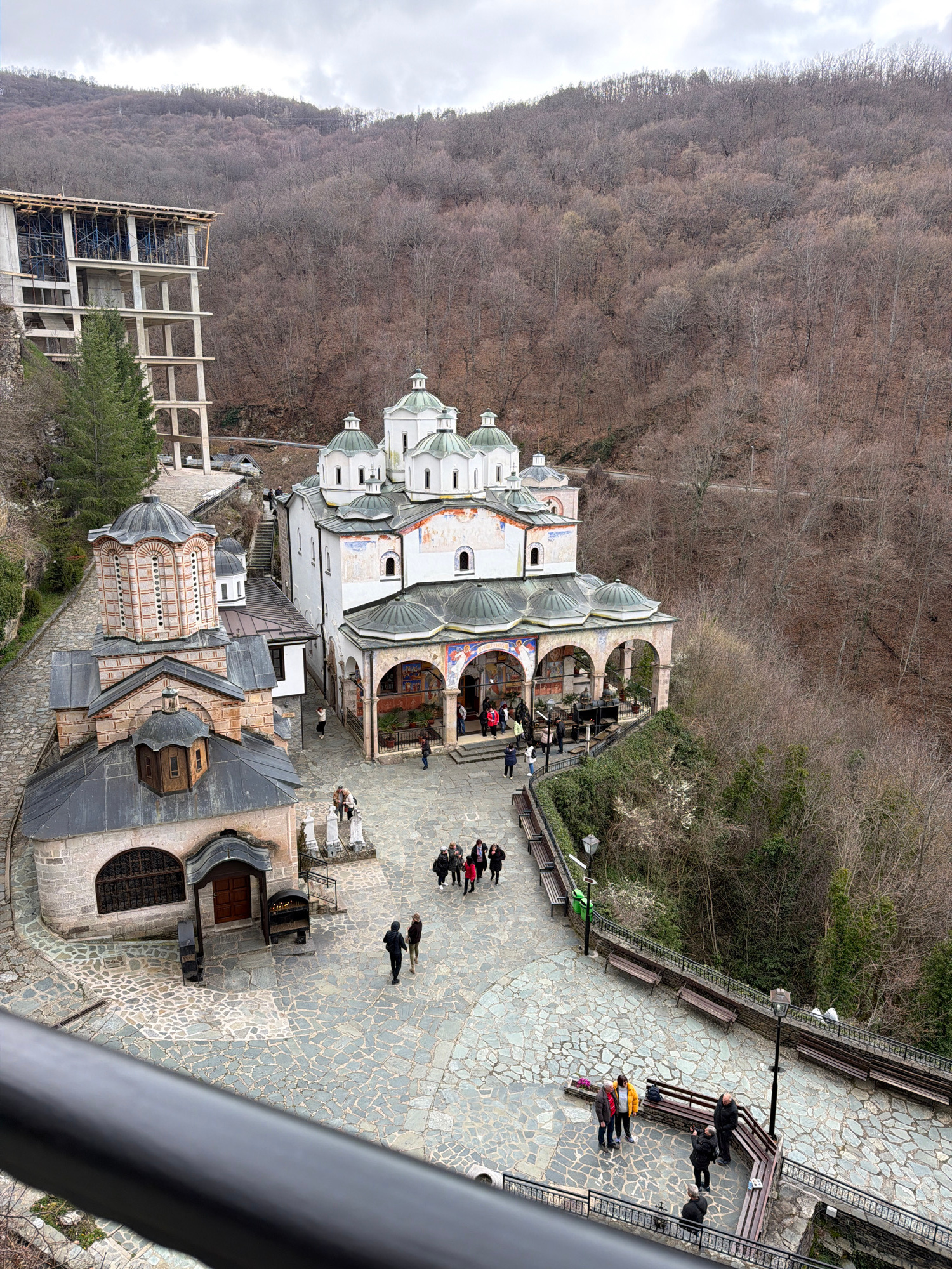The image shows a top-down view of the St. Joakim Osogovski Monastery complex, located near Kriva Palanka, North Macedonia. The monastery is comprised of multiple buildings with distinct architectural…read more