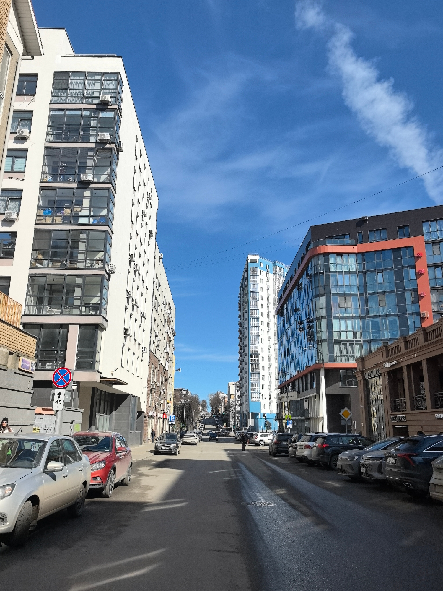 The image shows a street view in Nizhny Novgorod, Russia. It is a sunny day with a blue sky and some wispy clouds. The street is lined with buildings of varying heights and architectural styles, inclu…read more