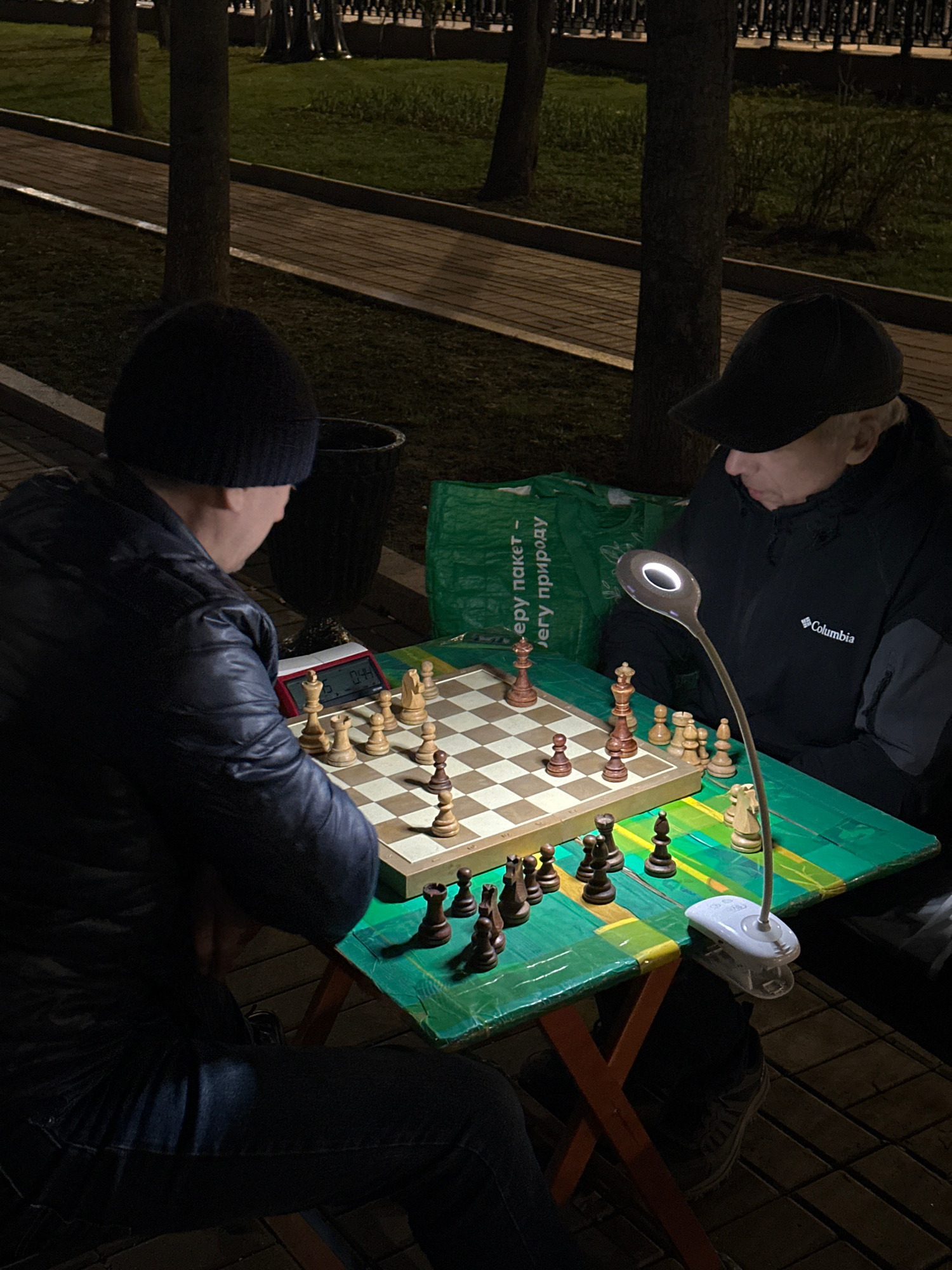 Two people are engaged in a game of chess outdoors at night. The chess board is lit by an adjustable lamp. One person is wearing a black Columbia jacket and a baseball cap. The other person is wearing…read more