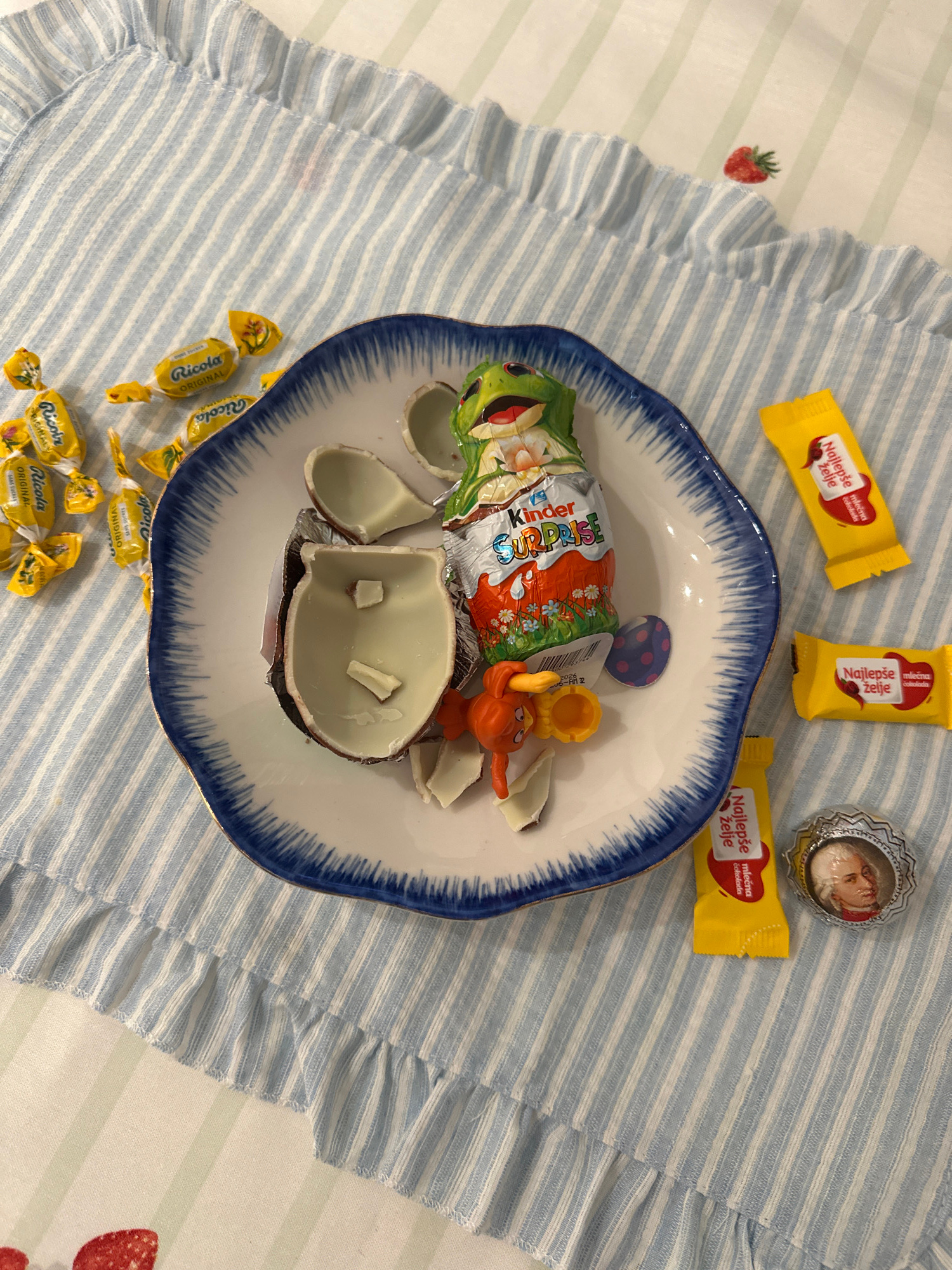 The image shows a plate of opened Kinder Surprise egg with the toy inside, surrounded by other sweets on a light blue and white striped tablecloth. There are three yellow wrappers labeled "Najlepše že…read more
