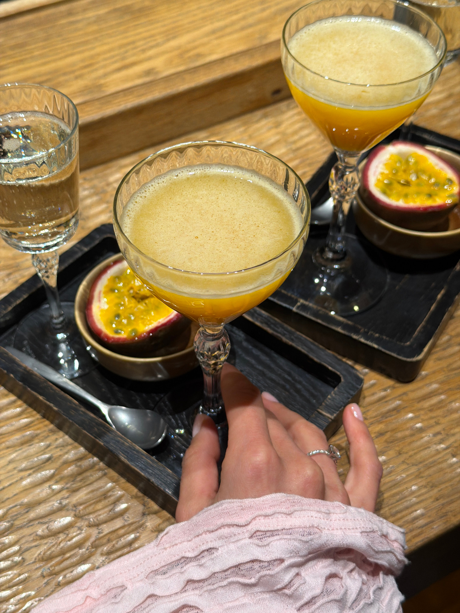 An overhead shot captures a tabletop scene featuring three beverages and a person's hands. Two stemmed glasses contain a frothy, opaque yellow-orange drink, possibly a cocktail or juice. A third stemm…read more