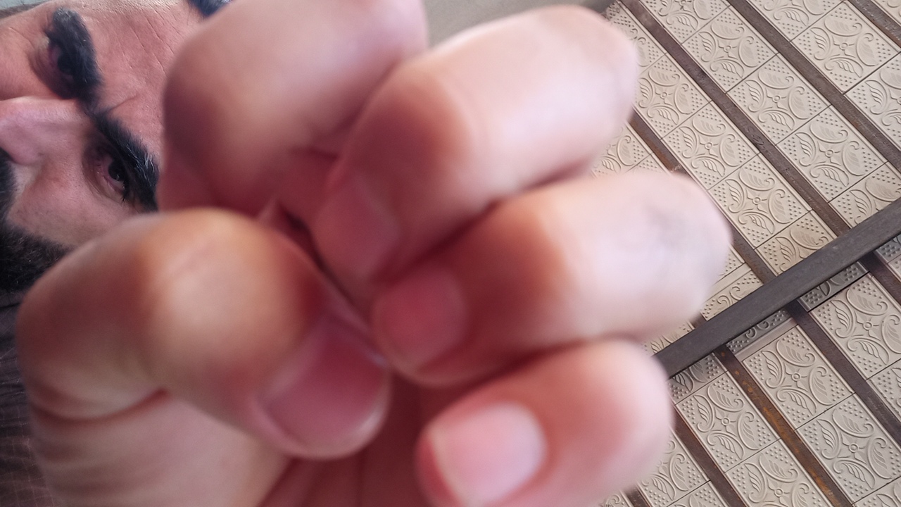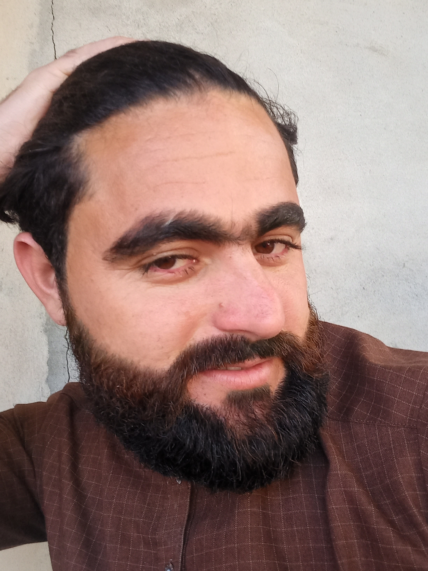 A close-up, rotated image shows a man with dark hair and a black beard. He has brown eyes and is wearing a brown, checkered shirt. A hand is visible near his head. The background is a light-colored, t…read more