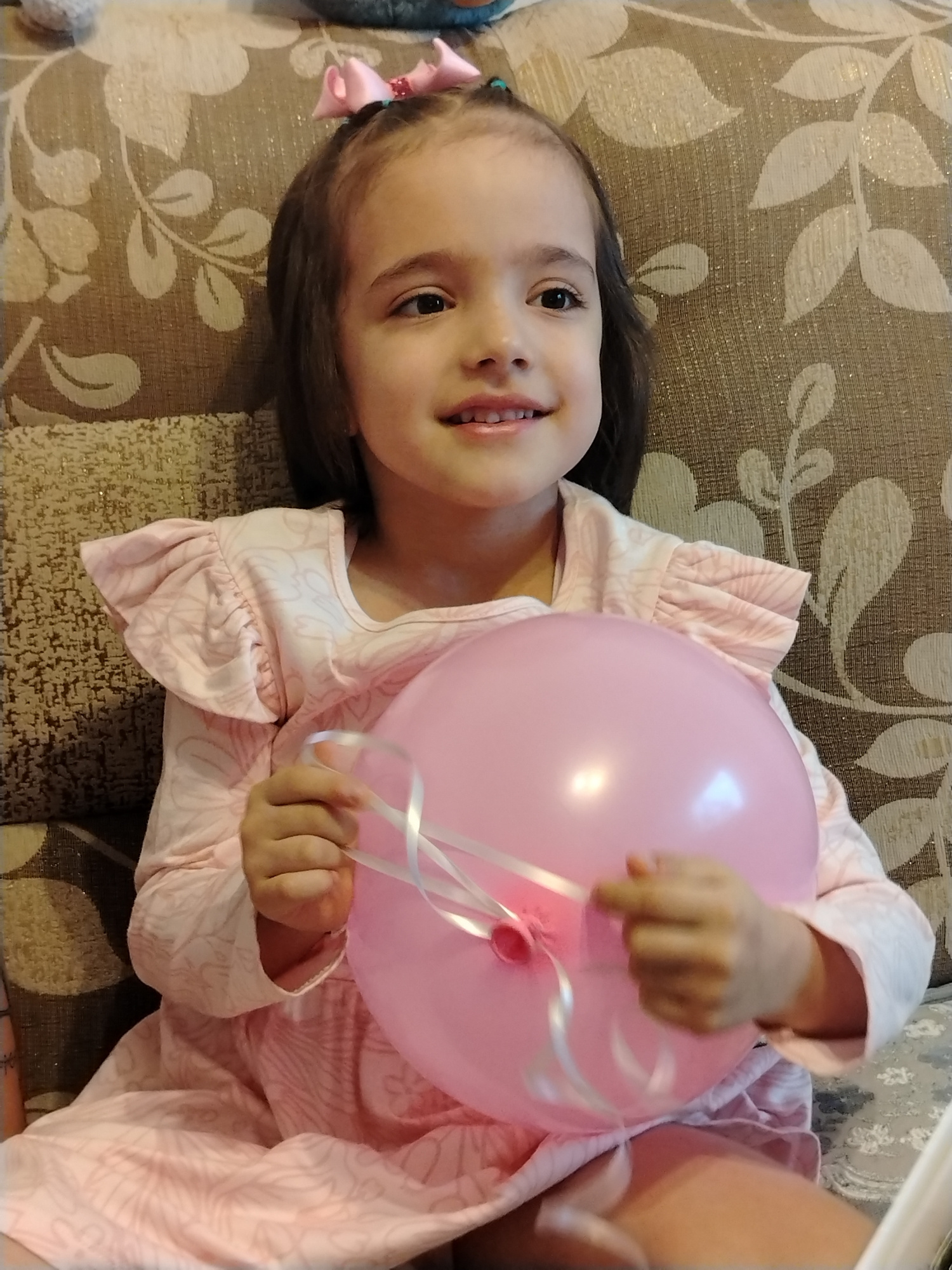 A young girl is sitting indoors, presumably on a sofa, holding a pink balloon with white ribbons. She has dark hair with a pink bow and is wearing a light pink dress with ruffled sleeves. The backgrou…read more