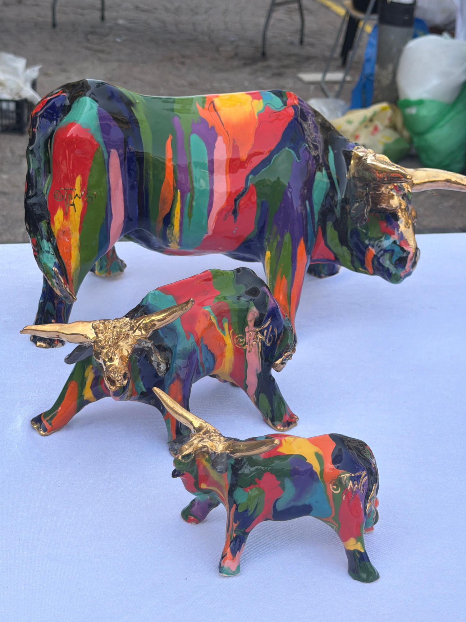Two brightly colored, abstract sculptures of bovine figures, likely bulls or oxen, are depicted against a plain white background. The original image is rotated 90 degrees clockwise, so the sculptures…read more
