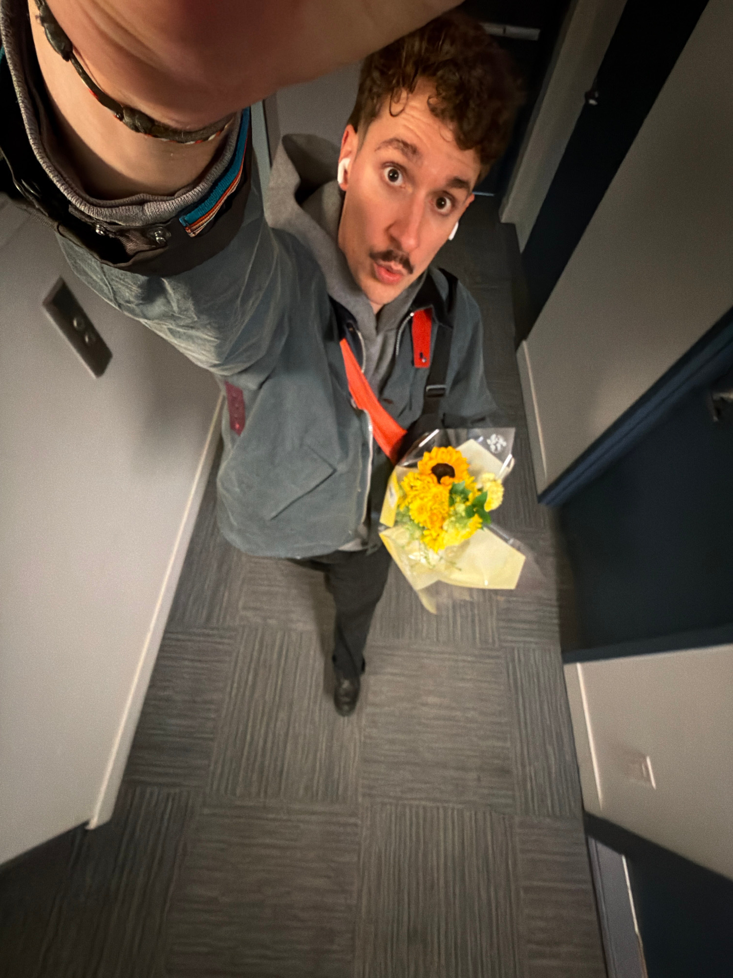 The image, taken from a high, overhead angle, shows a young man standing in an indoor hallway. The photograph is rotated, causing the man to appear sideways or inverted within the frame, but he is loo…read more
