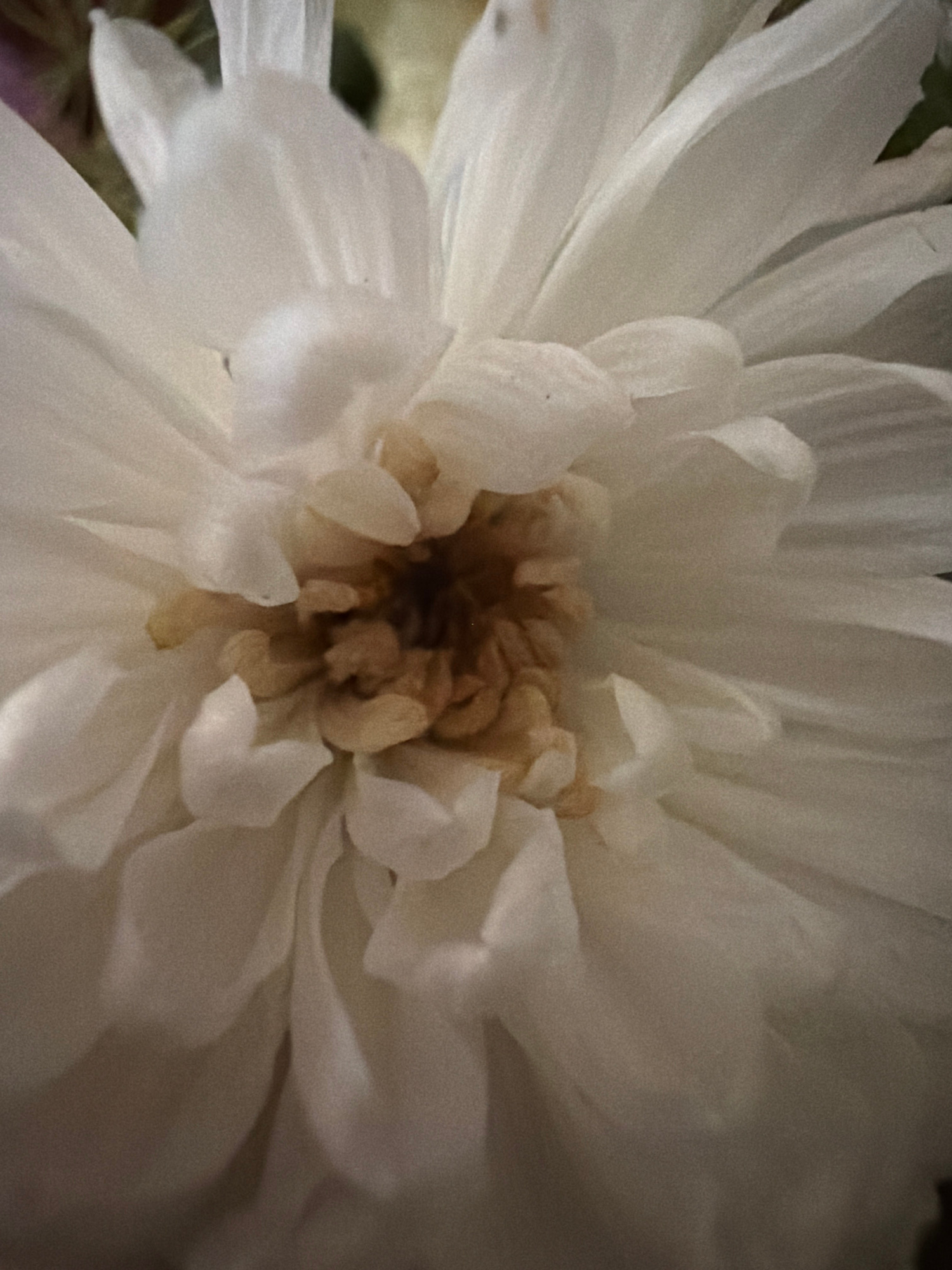 Close-up of a white flower with a brown center. The petals are soft and rounded, and the flower is in full bloom. The location is unknown, and there are no people, subjects, objects, actions, interact…read more