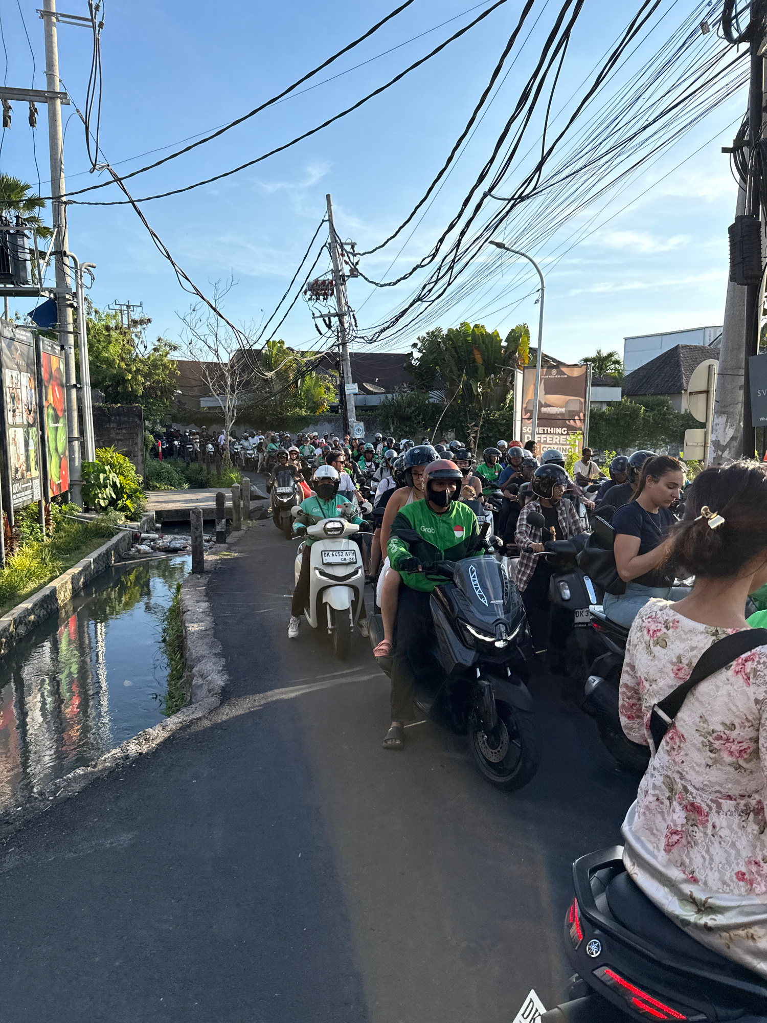 The image depicts a congested street in North Kuta, Indonesia, filled with a large number of motorcycles and scooters. Most drivers wear helmets. Many motorcyclists wear a green jacket with "Grab" dis…read more