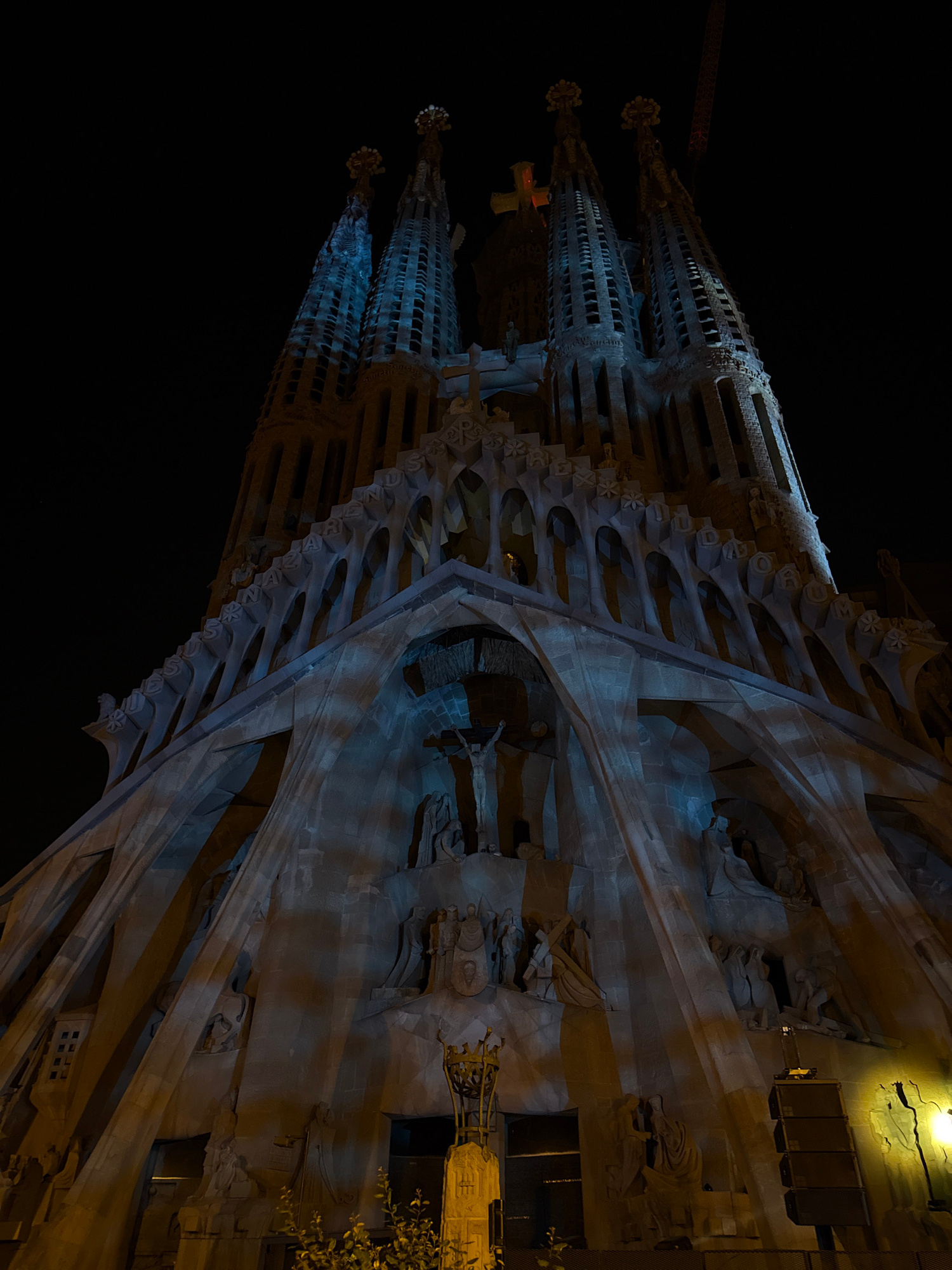 The image shows an architectural structure at night. The stone structure appears to be the Sagrada Familia in Barcelona, Spain. The architecture has multiple spires or towers, along with ornate detailβ¦read more