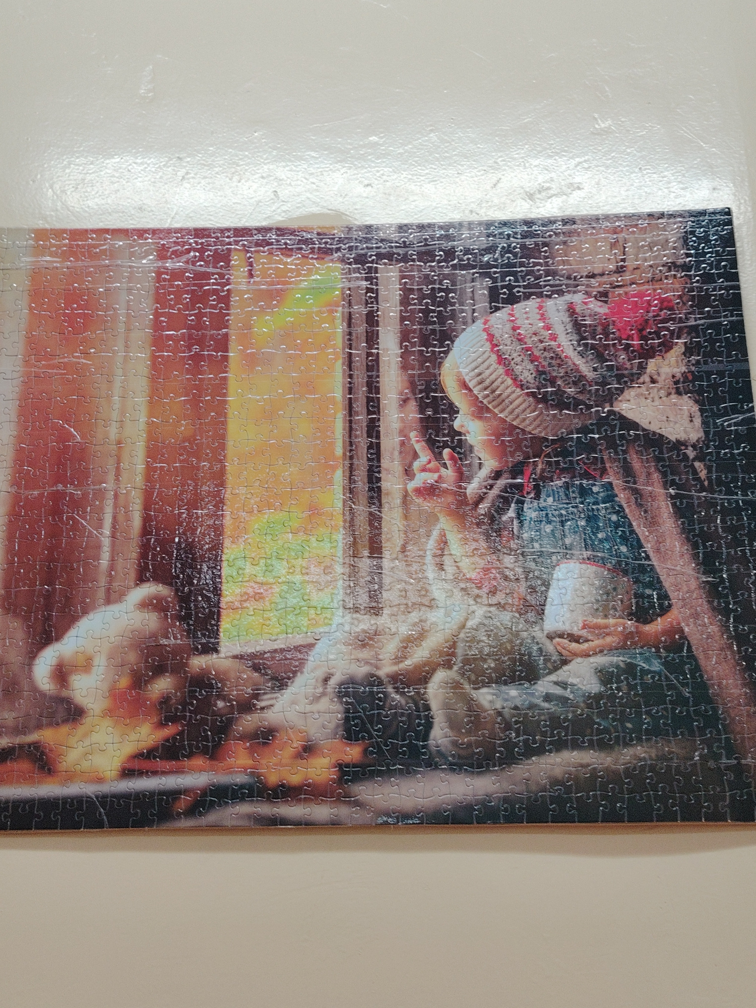 A completed jigsaw puzzle depicts a child in profile sitting by a window. The child wears a striped beanie and overalls and holds a white mug. Outside the window, there are blurred colors suggesting t…read more