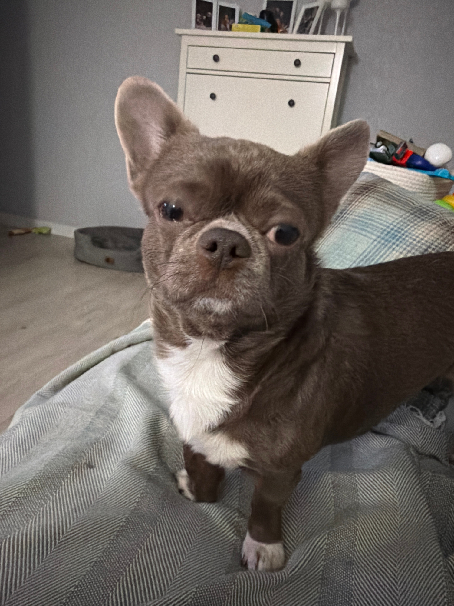 A brown and white Chihuahua is lying on a grey and blue striped blanket. The dog is looking up at the camera. The dog is lying on a bed. A white dresser is in the background to the left. There is no i…read more