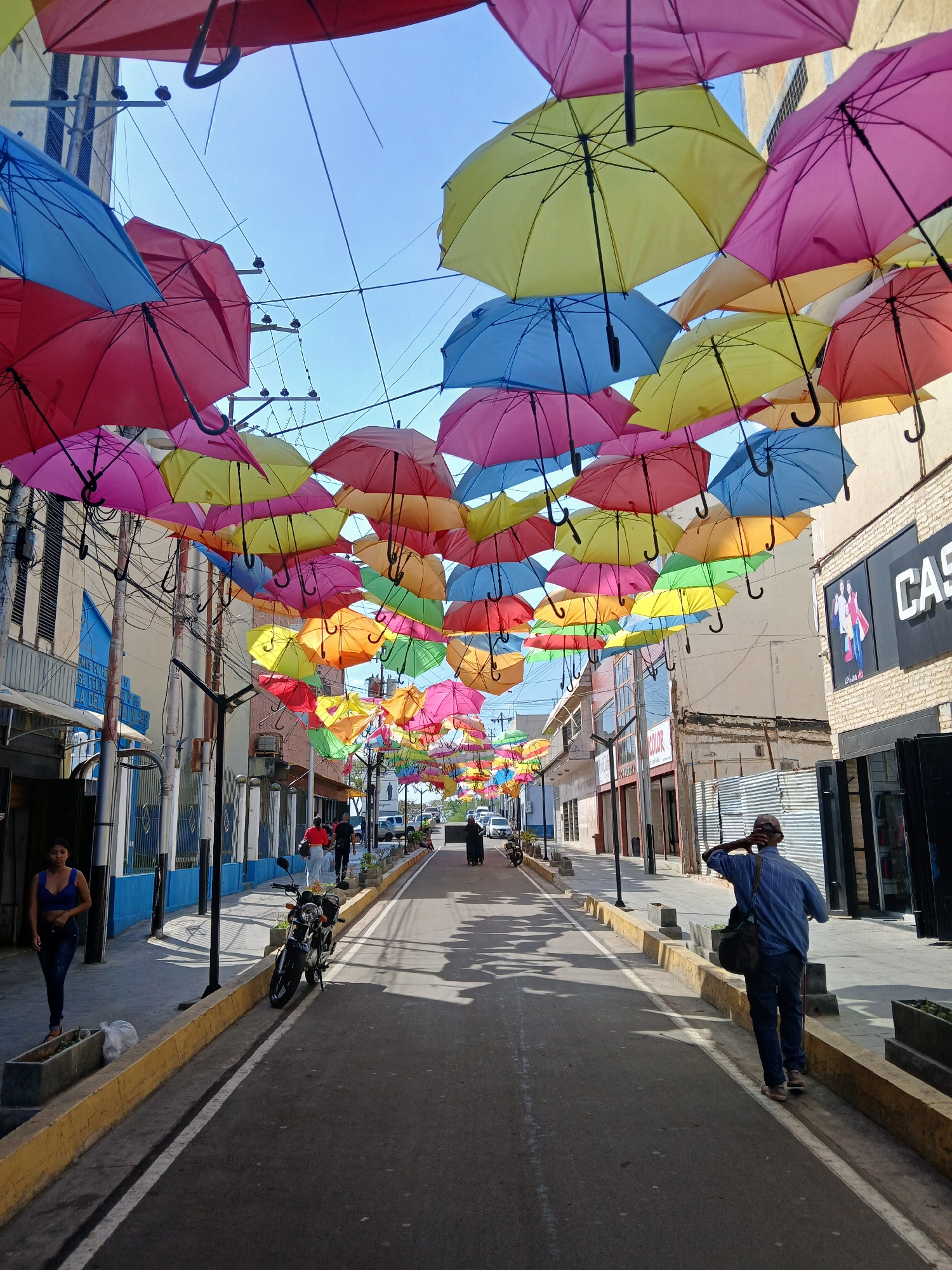 The image depicts a street in Ciudad Guayana, Venezuela, adorned with numerous colorful umbrellas suspended overhead. The umbrellas create a vibrant canopy, casting shadows on the street below. Pedest…read more