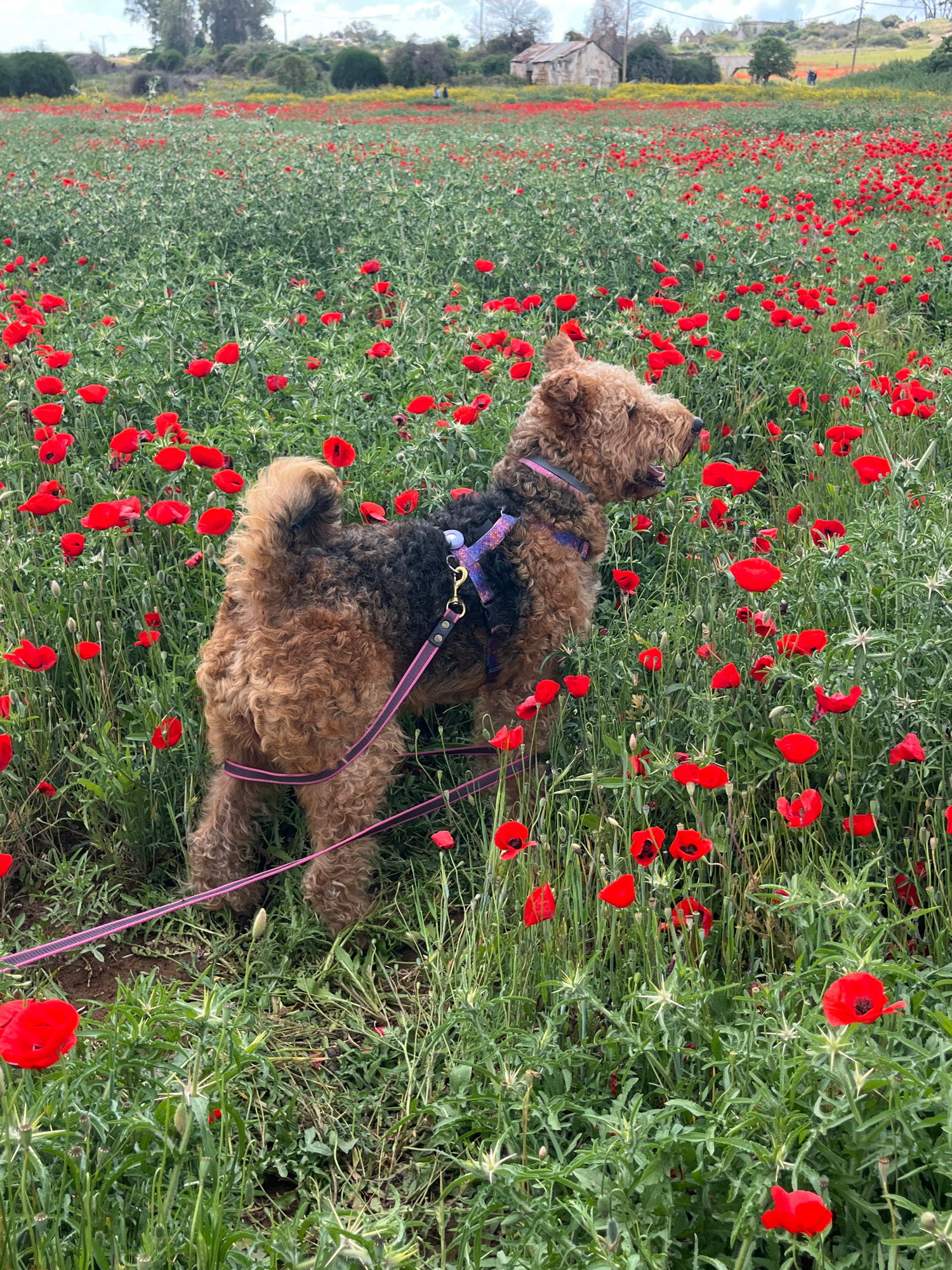 A medium-sized, brown Airedale Terrier with a dark-colored saddle marking is lying in a field of red poppies and green foliage. The dog is wearing a blue and pink harness and is attached to a pink lea…read more