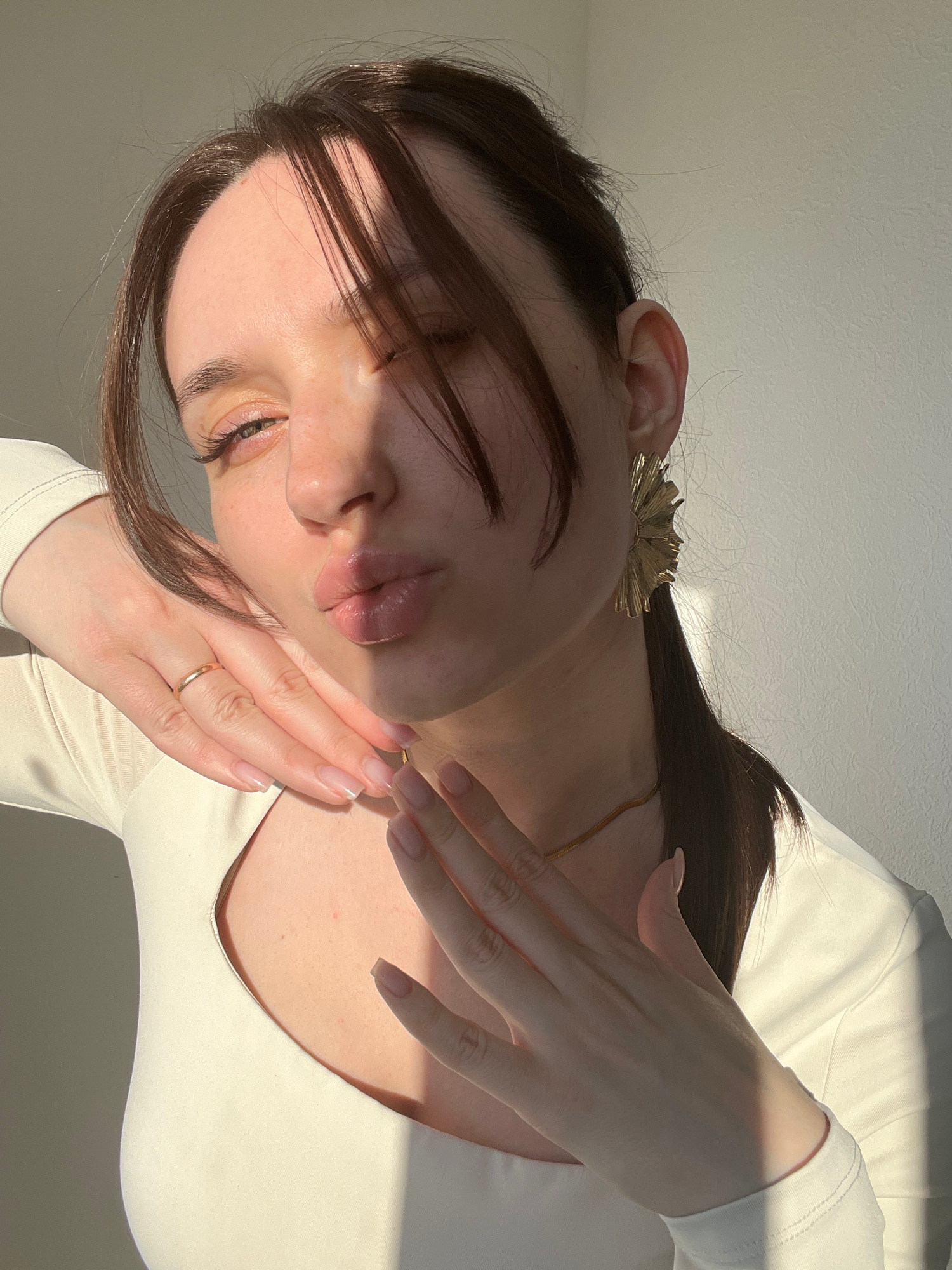 A woman with dark hair and light skin poses in a room with natural lighting. She is wearing a white long-sleeved top. A gold ring is visible on her left ring finger, and she wears a gold flower-shaped…read more