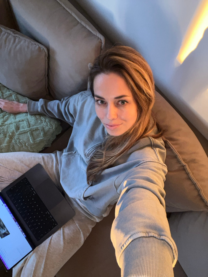 A female individual is observed reclining on a light brown upholstered sofa in an indoor environment identified as Bar, Montenegro. She possesses light brown hair and green eyes, and is dressed in a l…read more