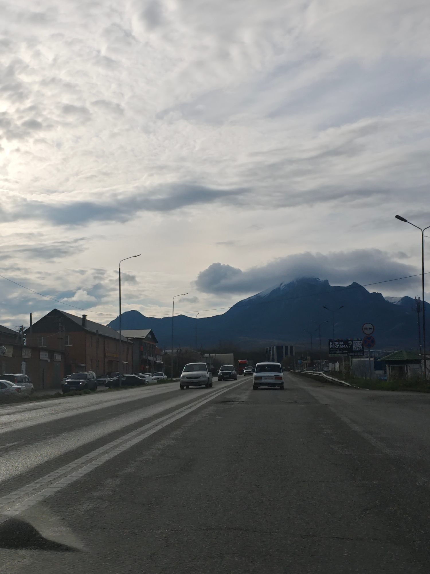The image shows a street in Inozemtsevo, Russia, with a mountain range in the background partially obscured by clouds. The road is paved with two parallel white lines marking the lanes. Several cars a…read more