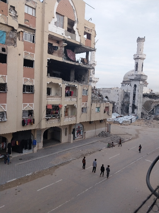The image depicts a damaged urban streetscape in Khan Yunis, Palestinian Territory, under an overcast sky. A multi-story, light-colored building on the left exhibits severe structural damage, with col…read more