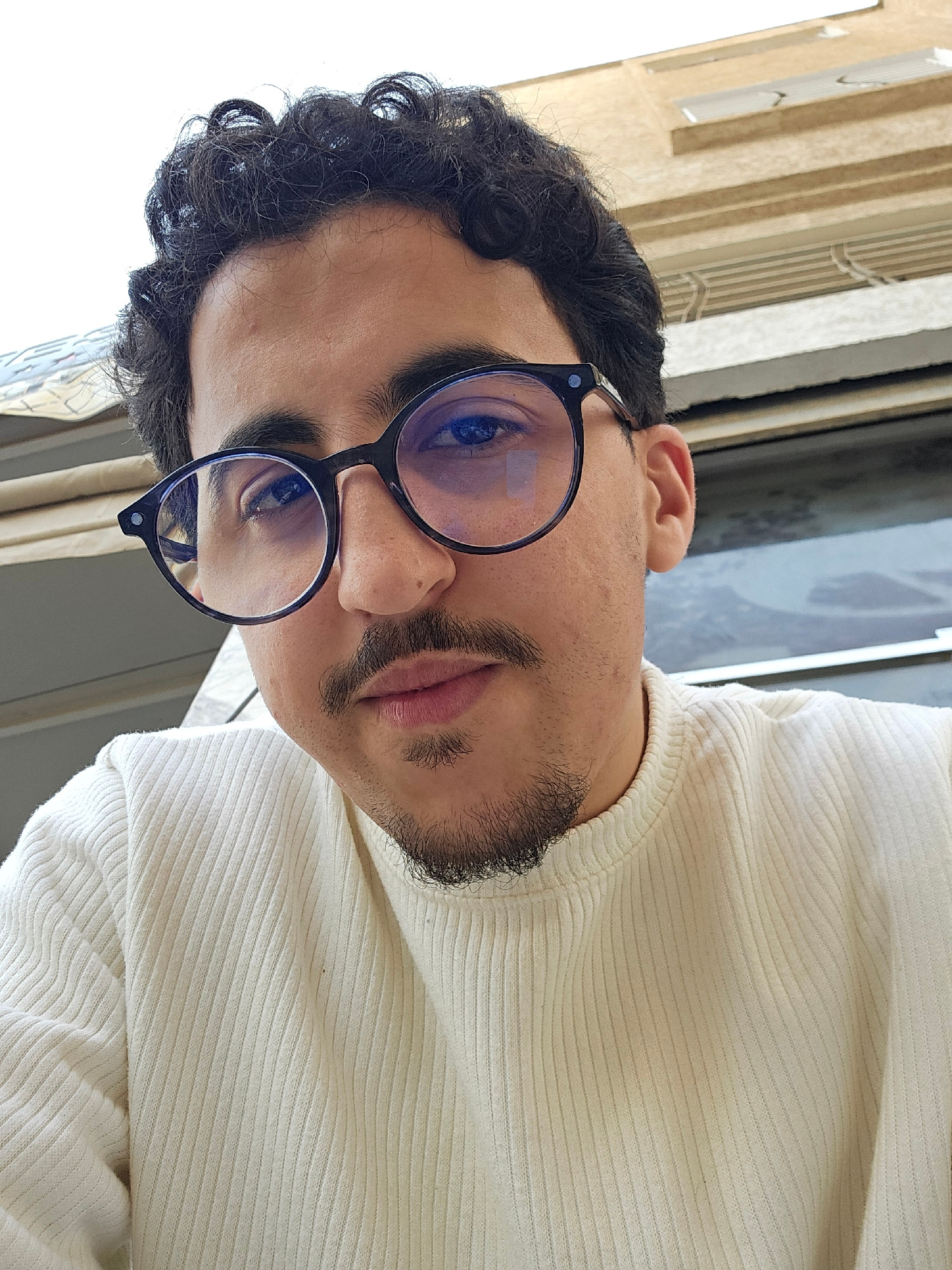 A man with dark curly hair, glasses, and a beard is wearing a white ribbed sweater. He is likely posing for a photograph. The background suggests an urban environment, possibly Fez, Morocco, with a bu…read more