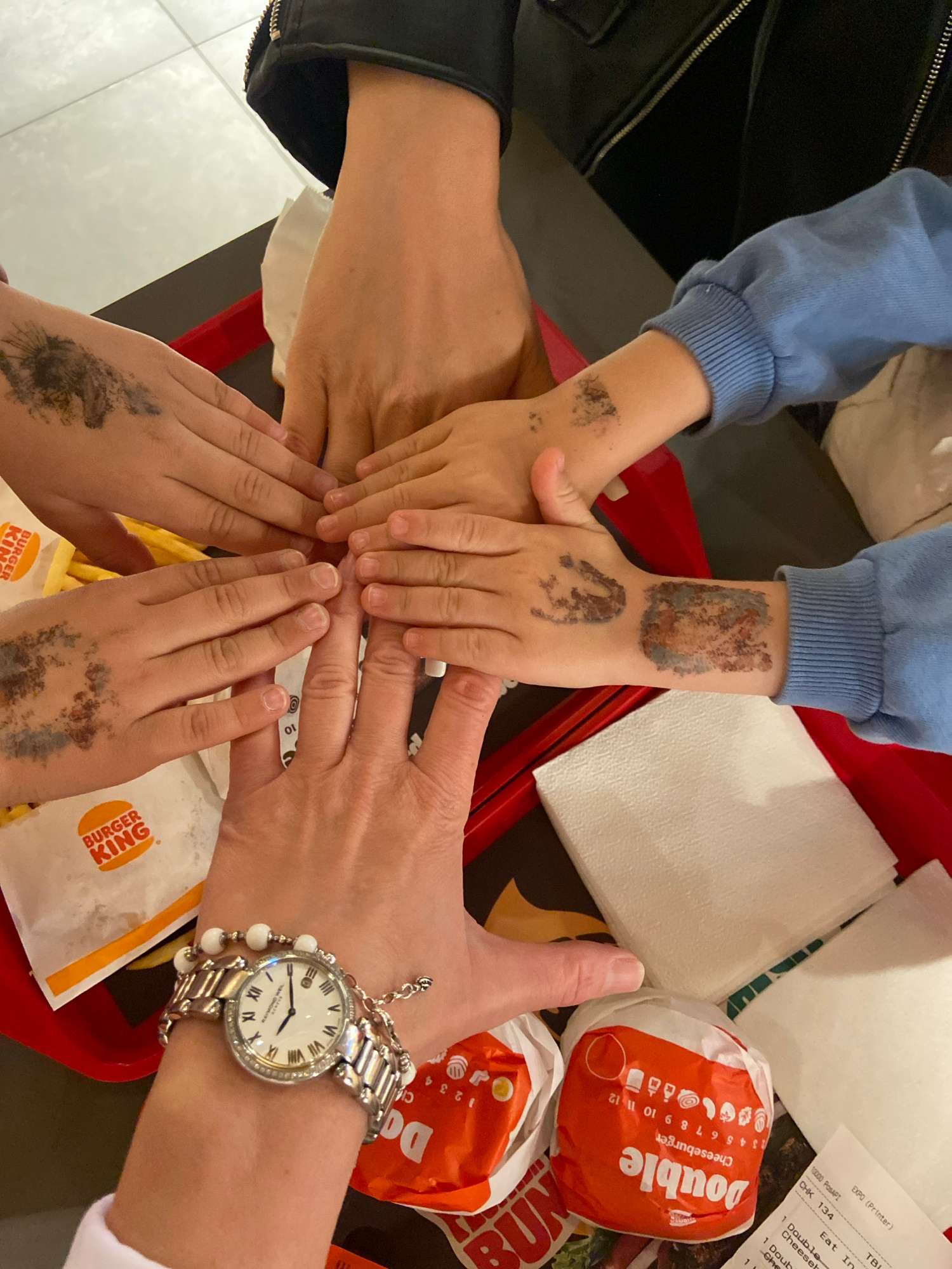 The image shows a group of people, including at least one child, placing their hands together in a circle above a fast-food meal, likely from Burger King. Three of the individuals have temporary-looki…read more