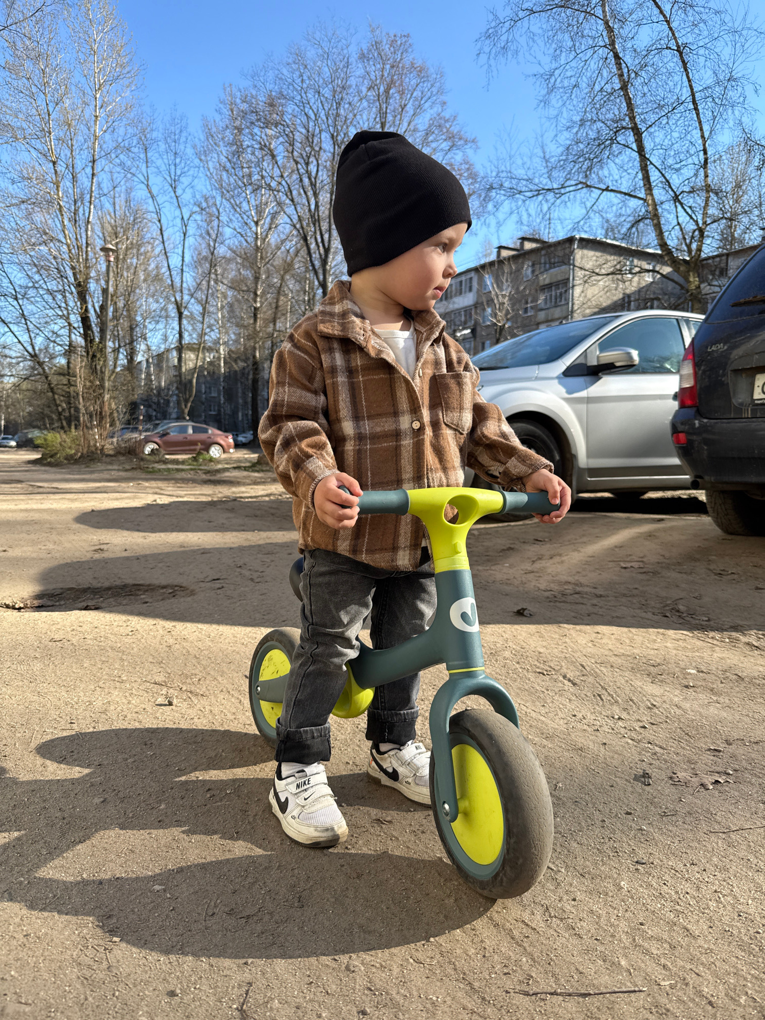 The image captures a young child on a balance bike outdoors in Rusanovo, Russia, under a clear blue sky. The child, appearing to be a toddler or preschooler, is dressed in a black beanie, a brown and…read more