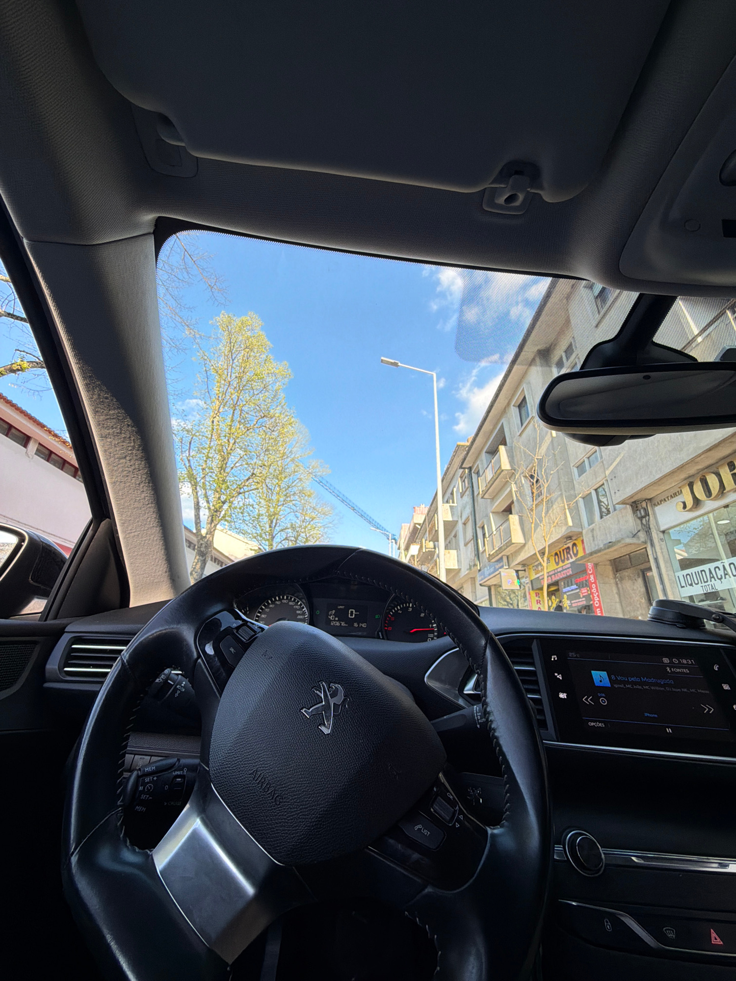 The image depicts a view from inside a car, likely a Peugeot, showing the steering wheel, dashboard display indicating "8 Vou pela Madrugada" by Mc Hilo, MC Wition, and others, and a portion of the in…read more