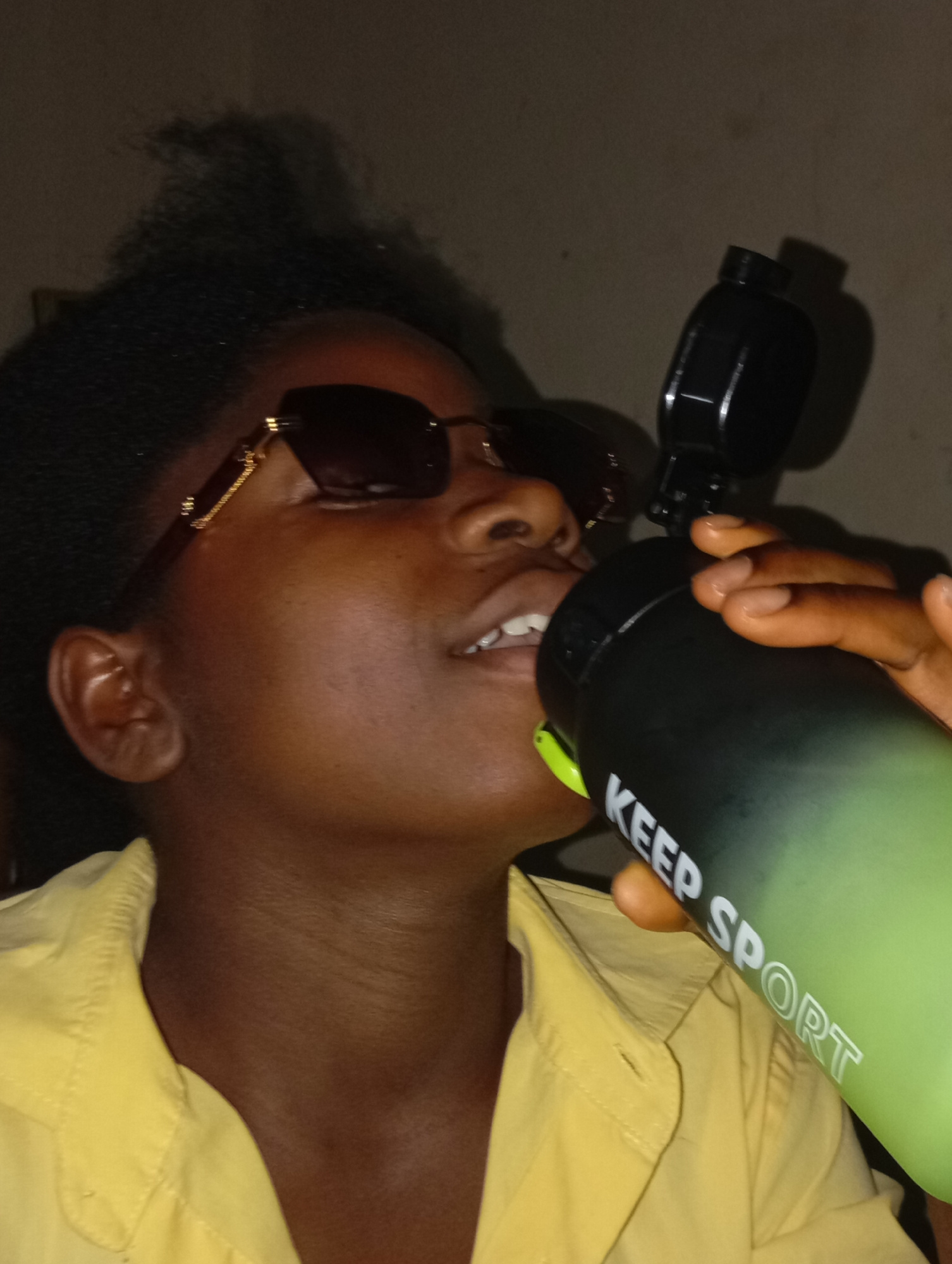 A person with dark skin and short, curly dark hair is drinking from a water bottle with "KEEP SPORT" printed on it. They are wearing brown sunglasses with gold detailing and a yellow button-up shirt.…read more