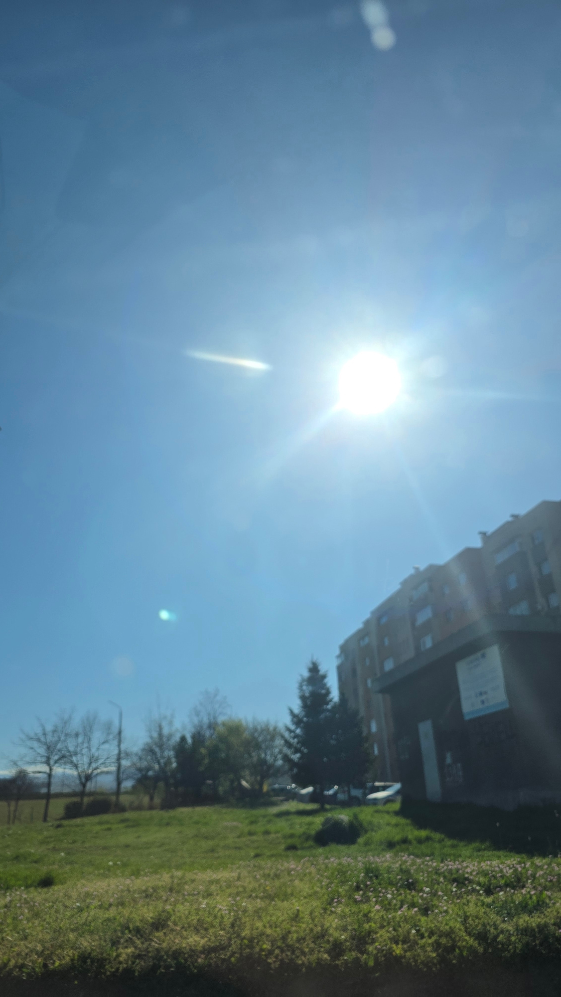 The image depicts a bright, sunny day. The sun is high in the sky, partially obscured by a slight haze. To the right, there is a grassy area with some wildflowers. A few trees can be seen in the backg…read more