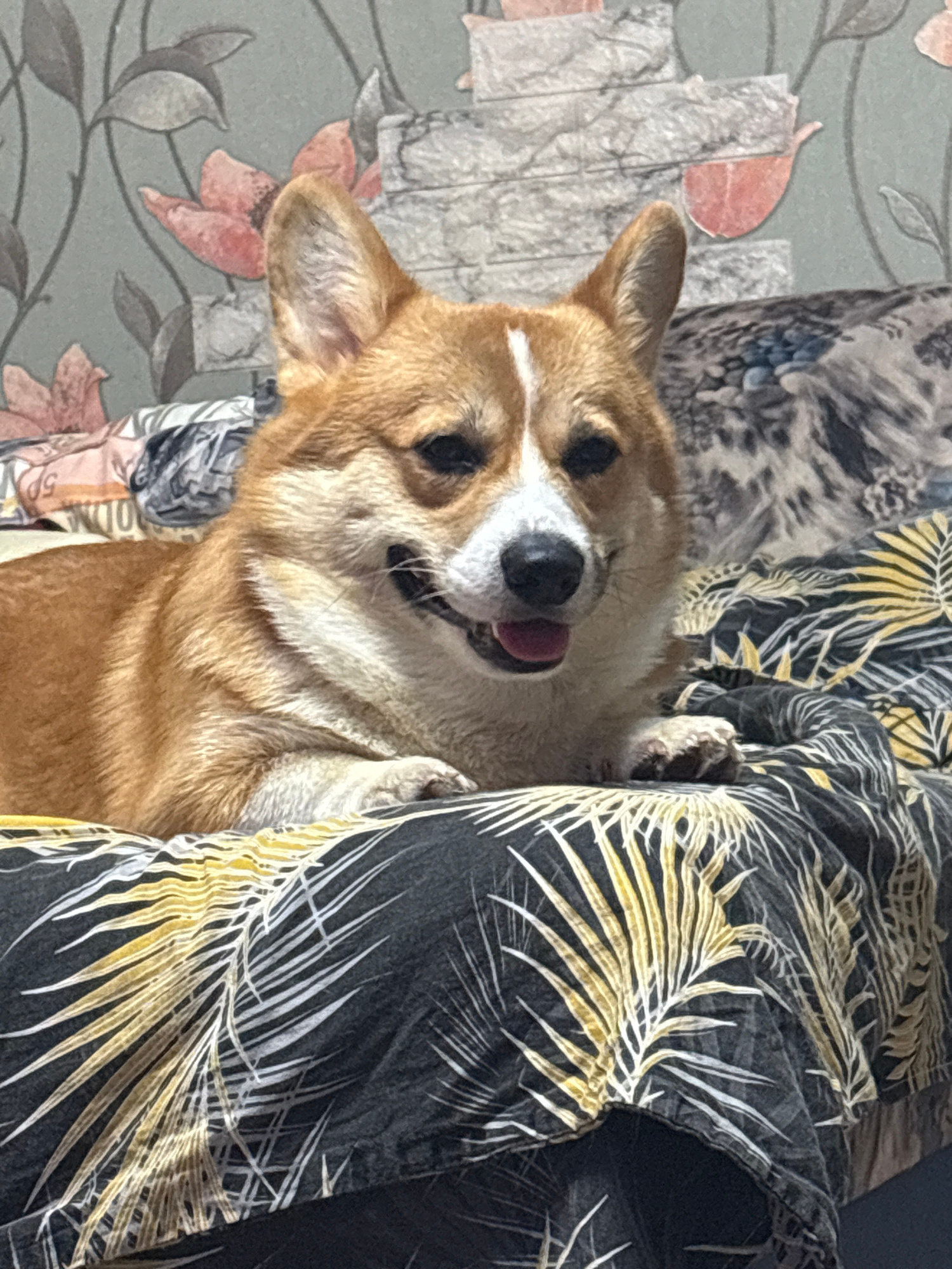 A close-up, rotated view shows a Pembroke Welsh Corgi dog resting on a bed in Klin, Russia. The dog has reddish-brown fur with a white stripe down its face, erect ears, and black eyes. Its mouth is sl…read more