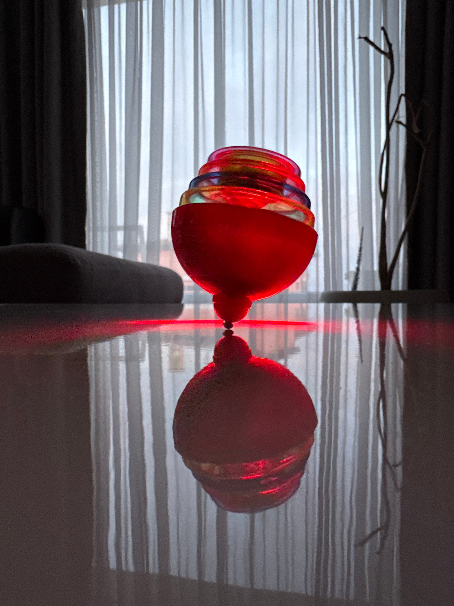 The image displays a highly reflective indoor scene, likely captured in Varna, Bulgaria, characterized by strong light and symmetry. Central to the composition is a vibrant, ruby-red, bulbous object,…read more