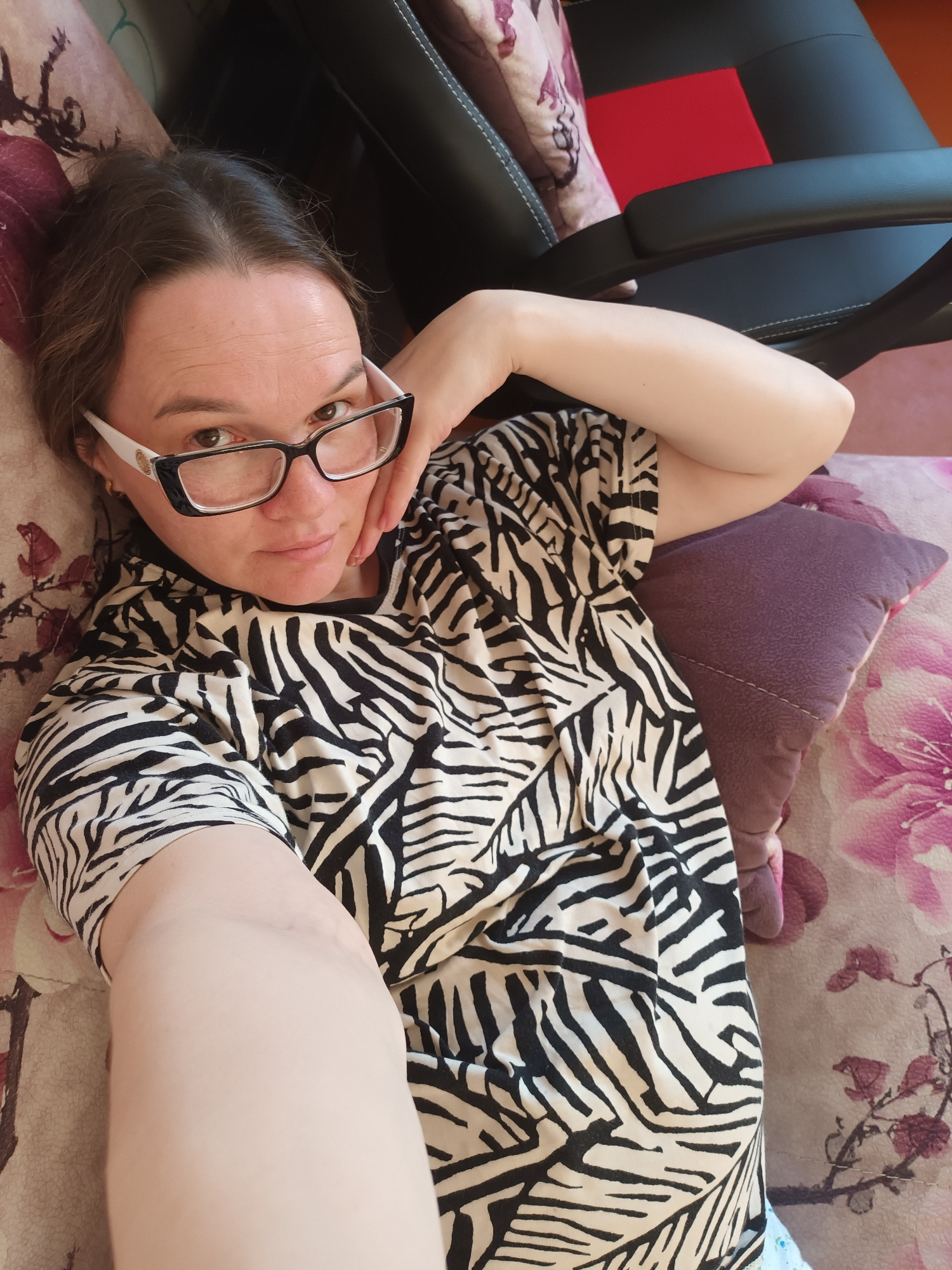 A woman with dark hair and wearing black and white framed glasses lies on a patterned couch, looking directly at the camera. She is dressed in a black and white zebra print top or dress. Her left arm…read more