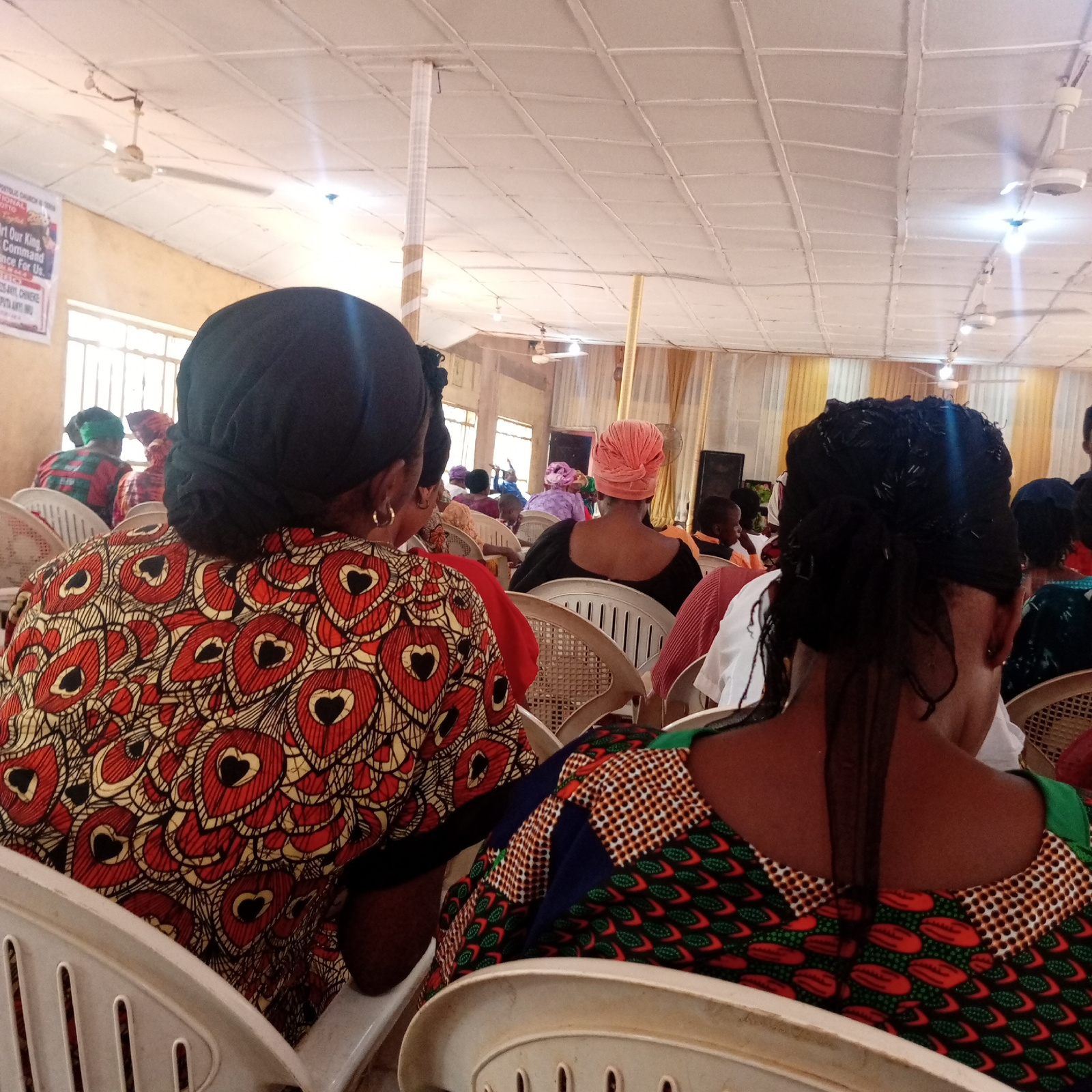 The image shows the interior of a building in Nsukka, Nigeria, with rows of white plastic chairs occupied by individuals, primarily women, facing forward. The subjects are wearing diverse clothing wit…read more