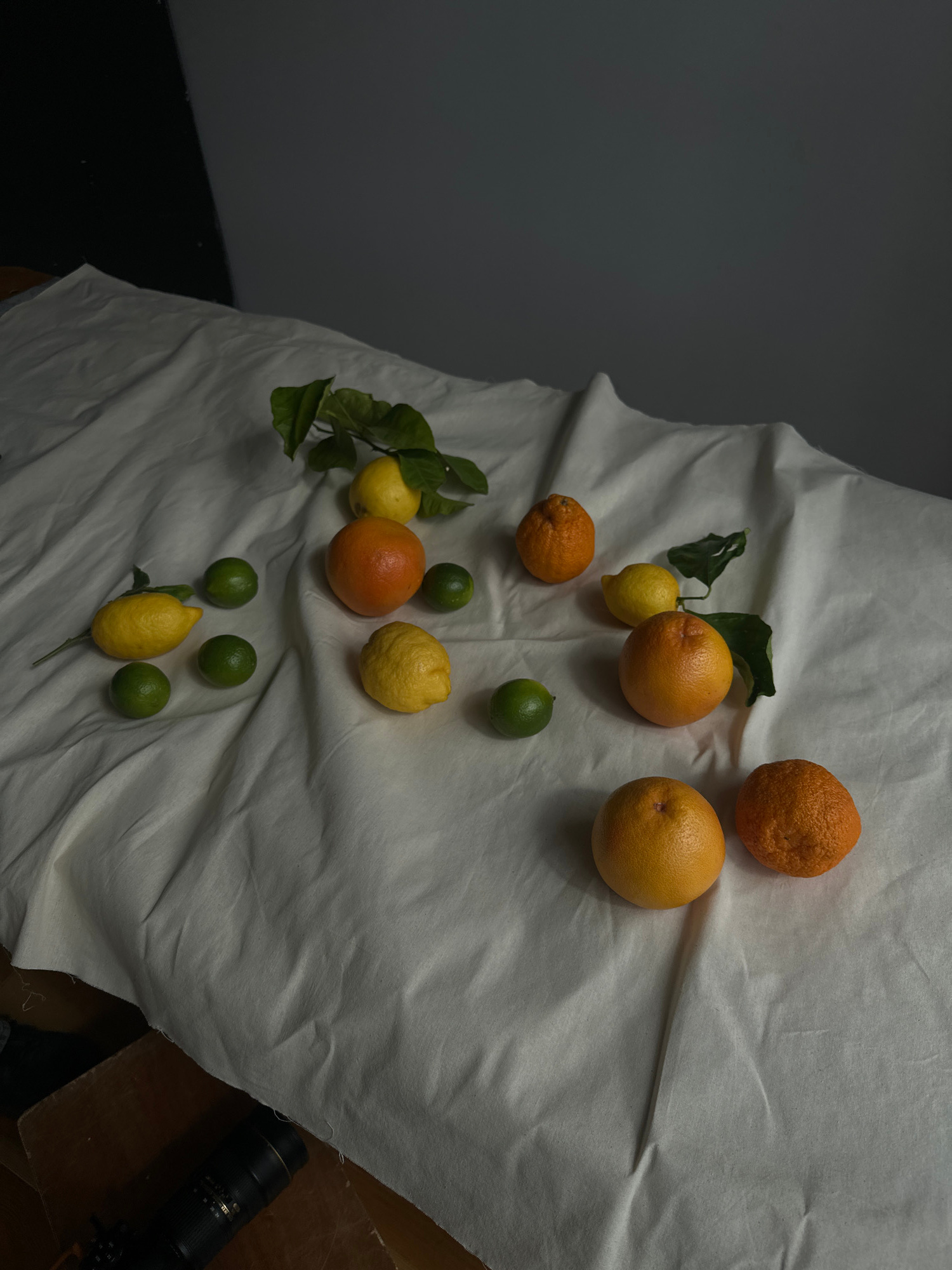 The image presents an overhead view of a still life composition featuring a variety of citrus fruits arranged on a crumpled, light-colored fabric. The fruits include several oranges (some with a textuβ¦read more
