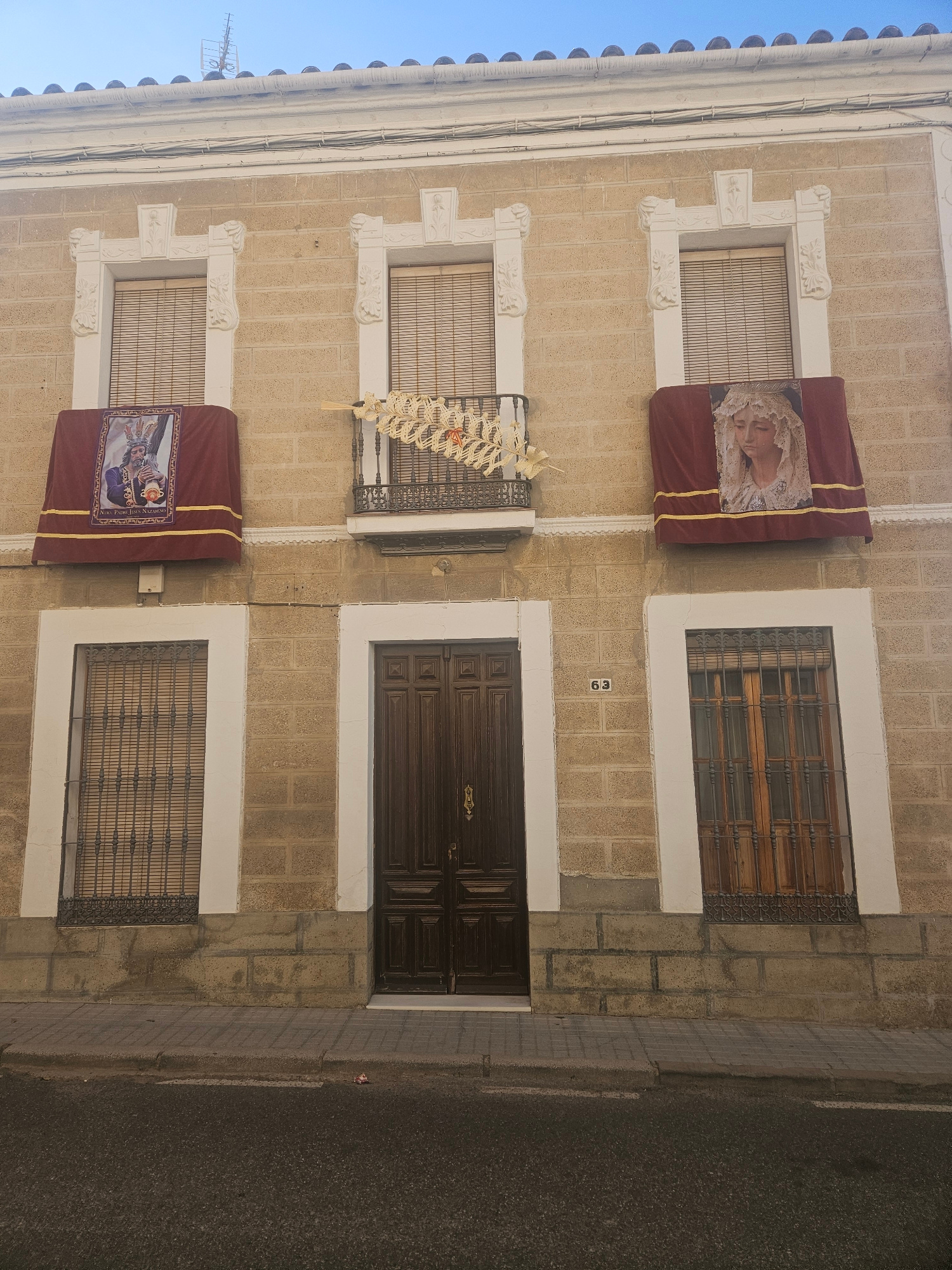 A vertically oriented exterior shot depicts a building facade in Pedro Abad, Spain. The facade consists of light brown stonework, with three stories visible. The windows on the left side of the facade…read more