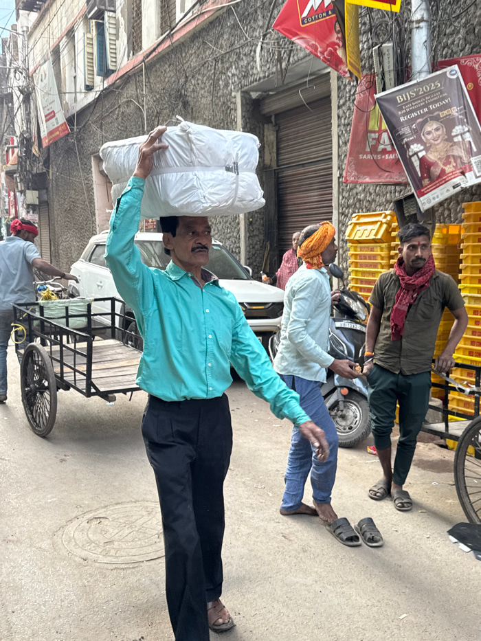 This image captures a daylight scene on a bustling commercial street in Kolkata, India. In the foreground, an adult male, approximately 40-50 years old, with a mustache, wearing a light blue long-sle…read more