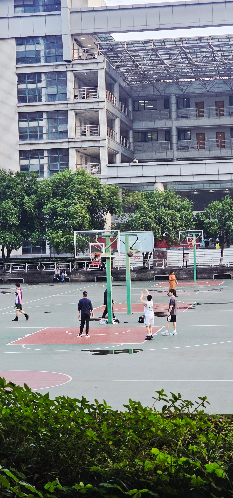 The image depicts a vertical view of a basketball court located in the Yuzhong District of China. Several individuals are present on the court, some appearing to be engaged in a basketball game. A tal…read more
