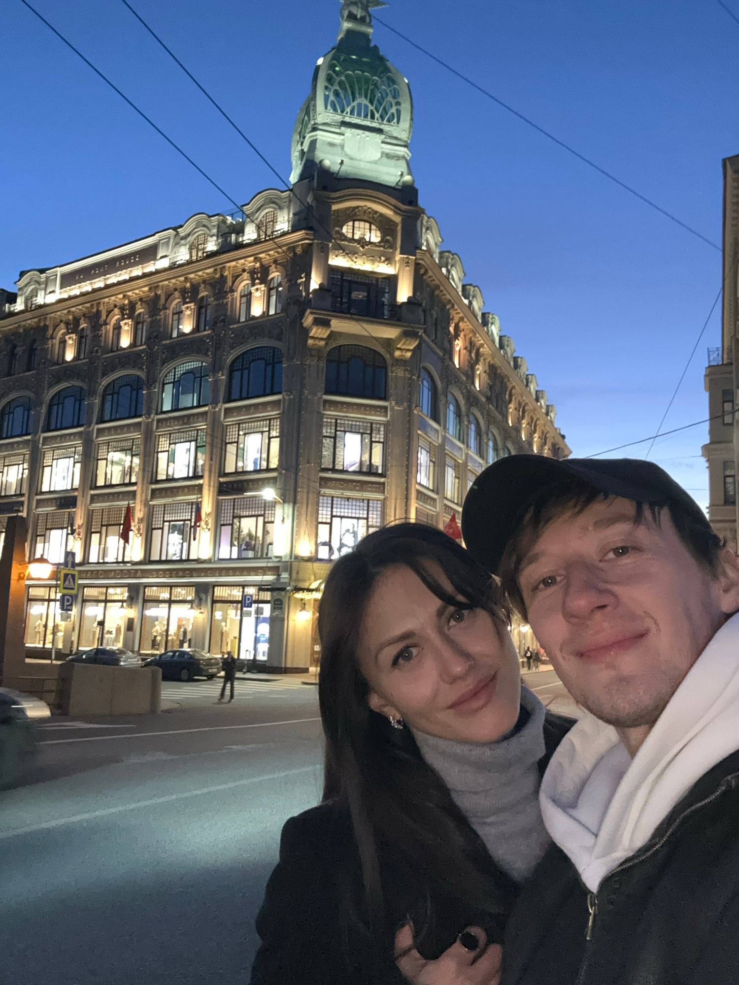 Two individuals are posing for a selfie in front of the historic Singer House building in Saint Petersburg, Russia. The building, notable for its Art Nouveau architectural style and domed tower, is il…read more