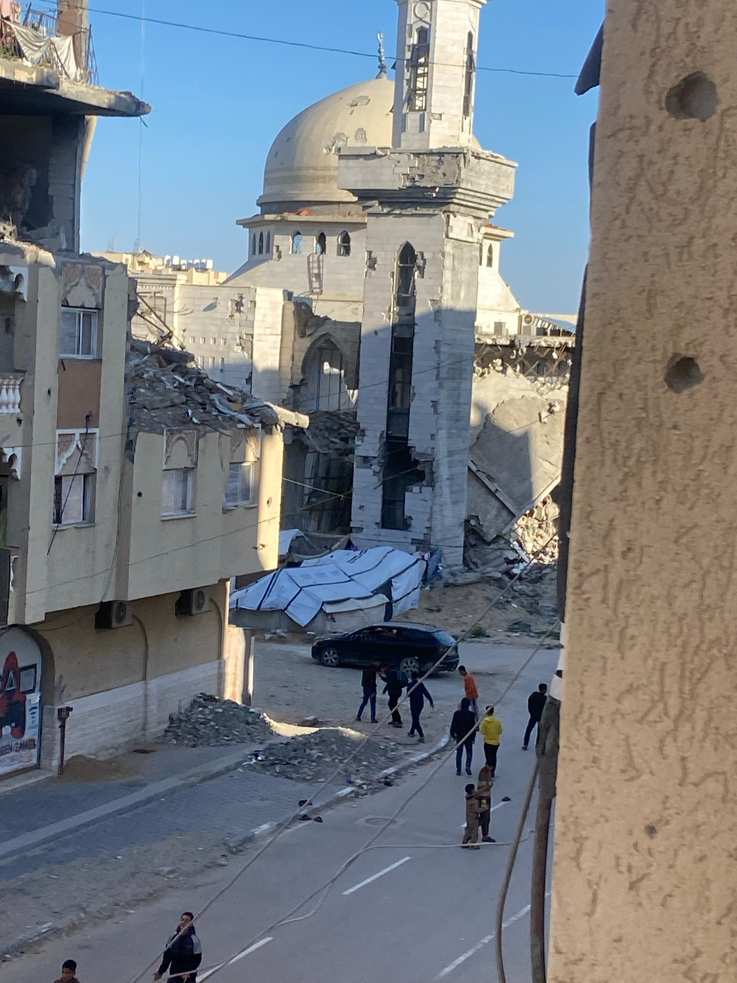 The image captures a scene of urban destruction in Khan Yunis, Palestinian Territory, under a clear daytime sky. A prominent, light-colored building, featuring a dome and a partially collapsed minaret…read more