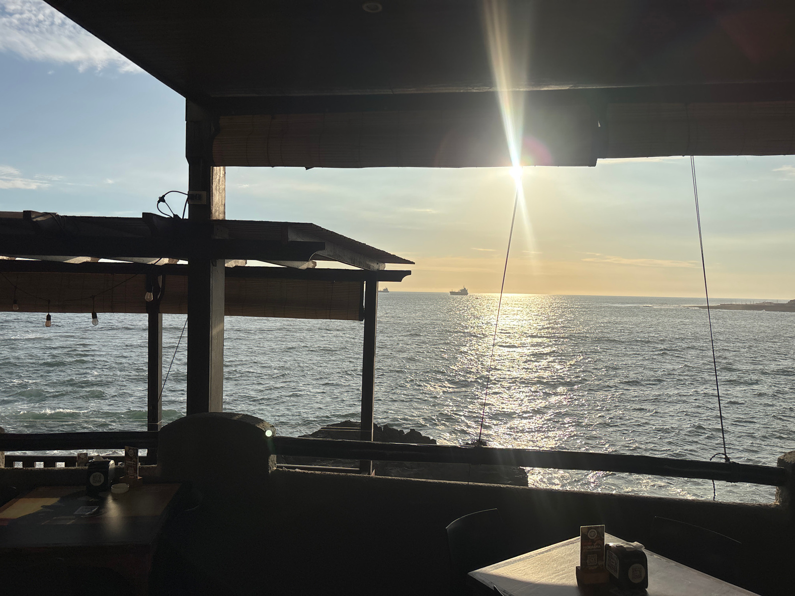 The image presents a scenic view of the ocean from a dimly lit, wooden-structured interior, likely a coastal restaurant or cafe in Arica, Chile. The perspective looks outwards, framed by the building'…read more