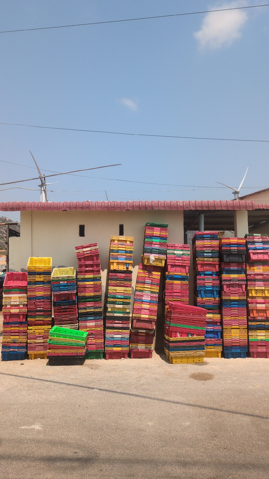 A large pile of stacked colorful plastic crates sits beside a building in Phước Dinh, Vietnam. The crates are predominantly red, yellow, green, and blue, and stacked in tall columns. The building has…read more