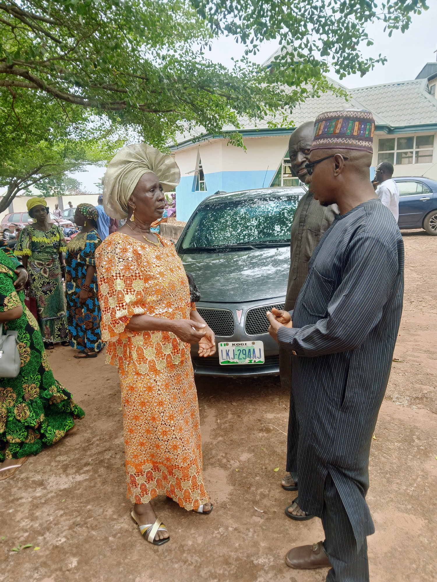 A man and a woman are standing in front of a car, seemingly in conversation. The man is wearing a dark, vertically striped suit, a traditional hat, and glasses. The woman is wearing an orange, lace-pa…read more