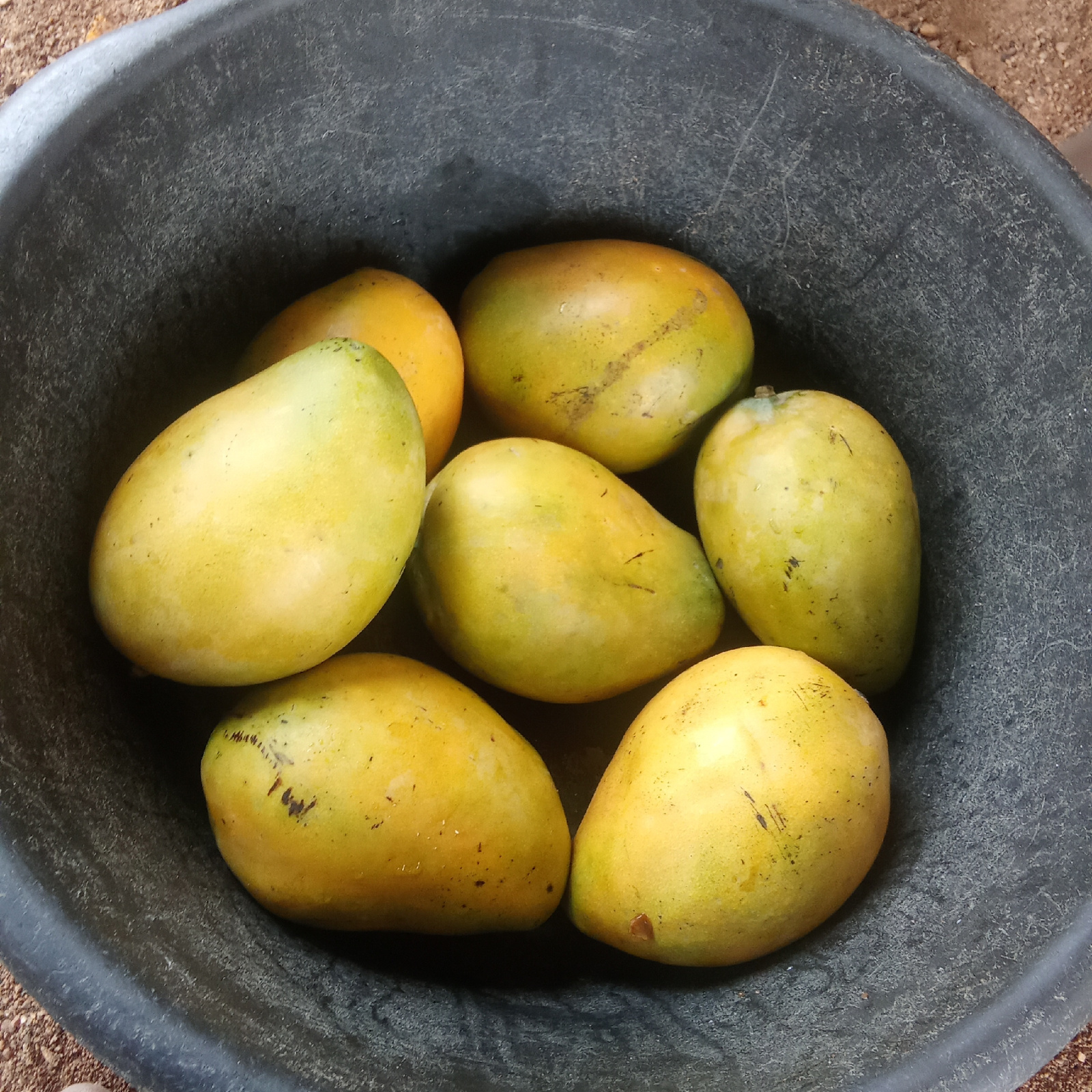 A top-down shot shows a black plastic tub containing seven ripe mangoes. The mangoes exhibit varying shades of yellow and green, indicating ripeness. The tub itself sits on a reddish-brown surface of…read more
