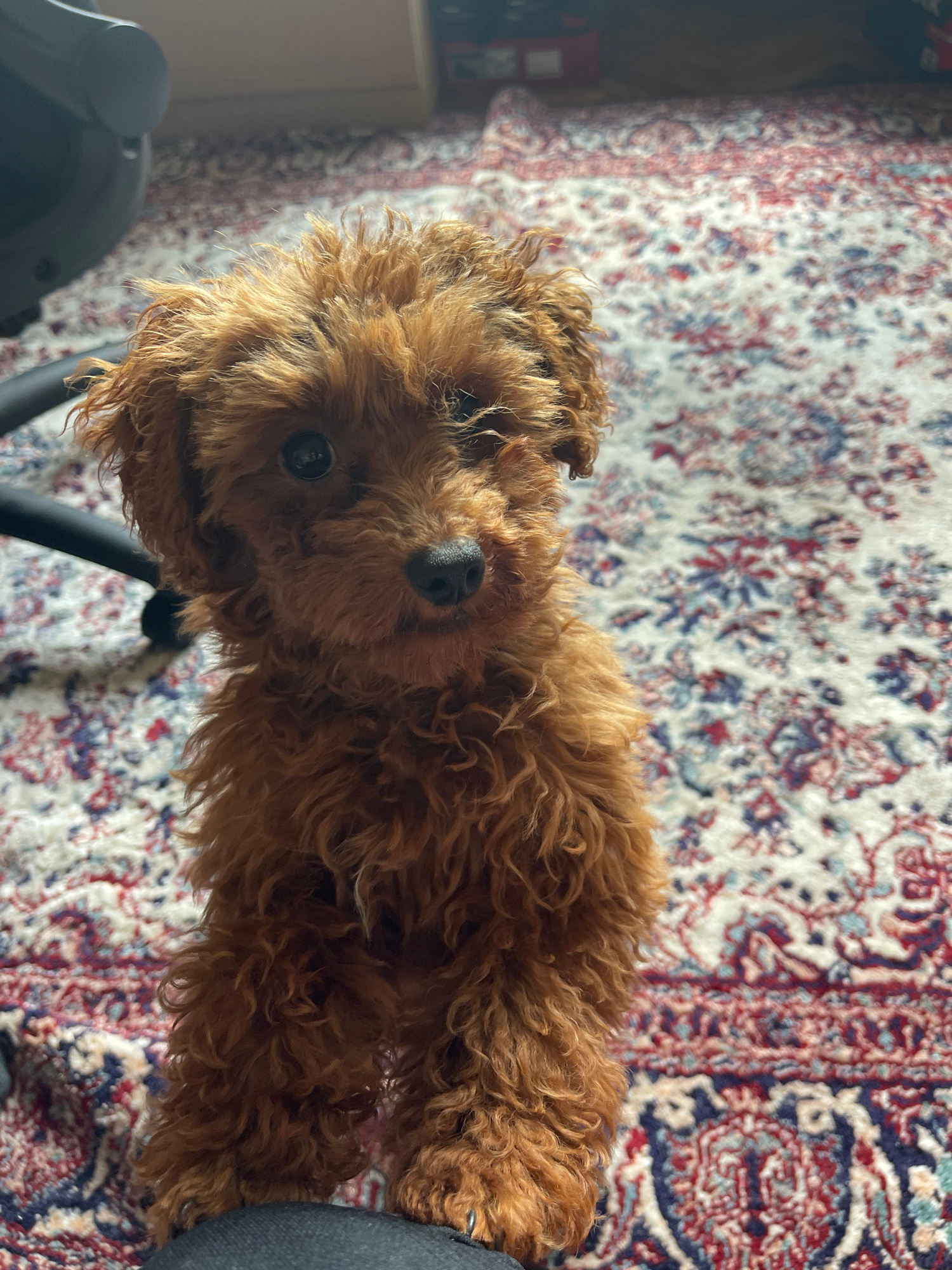 The image displays a small, reddish-brown dog with curly fur, likely a poodle or a similar breed, looking directly at the camera with its head tilted slightly. Its dark eyes and black nose are clearly…read more