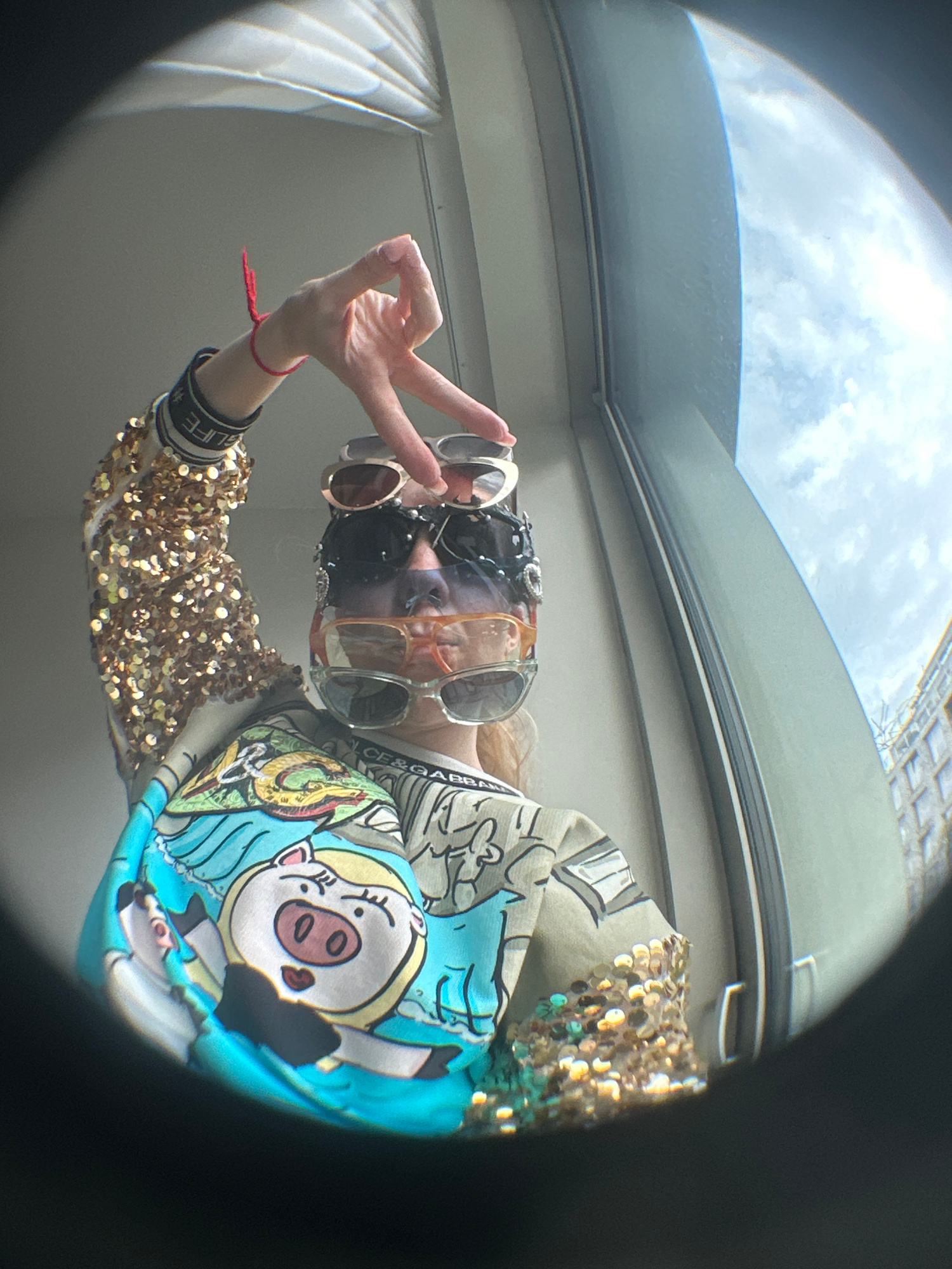 A person is looking through a peephole or fisheye lens. The person is wearing several pairs of sunglasses stacked on their face and making a hand gesture. The person has on a sequined jacket and a pat…read more