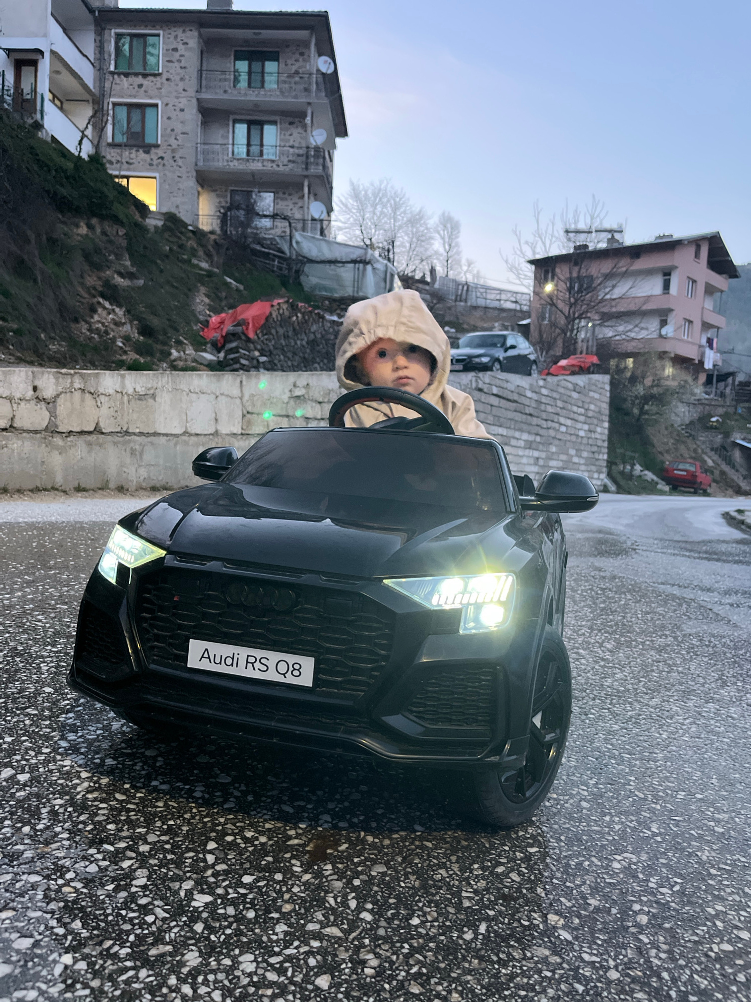 A young child wearing a light-colored hooded jacket is seated in a black toy car, specifically an Audi RS Q8, on a wet paved road. The car's headlights are illuminated. The location appears to be Chep…read more