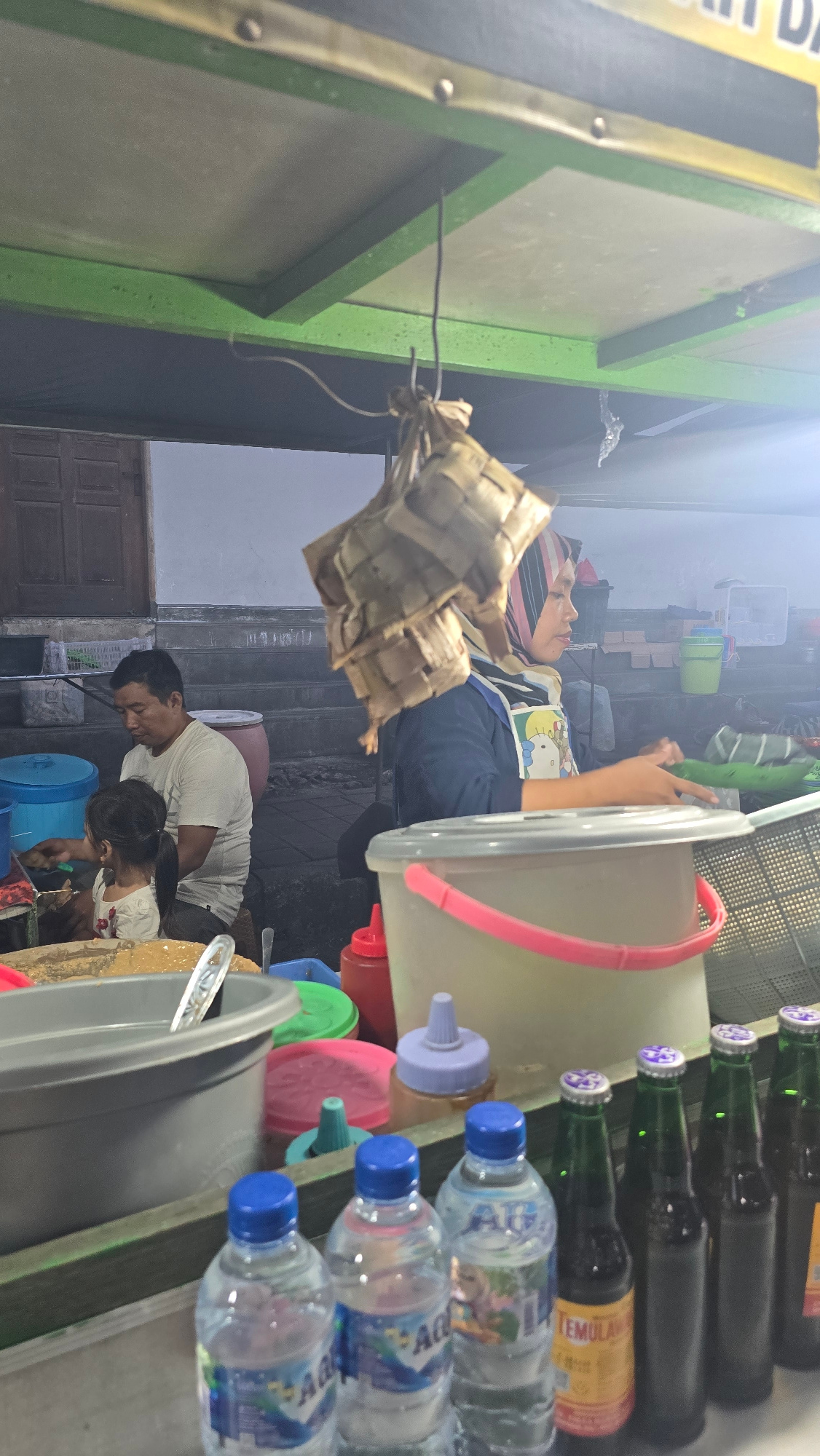 The image shows a street vendor in Klungkung, Indonesia. A person in a striped head covering is lying on what appears to be a bench or elevated platform. A father and daughter are seen working near th…read more