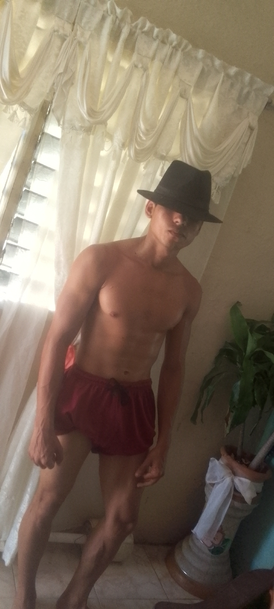 A shirtless, fair-skinned male stands in a room with a black fedora covering his forehead and eyes. He wears short, maroon athletic shorts. Behind him are white curtains, a window, and a large pottedβ¦read more