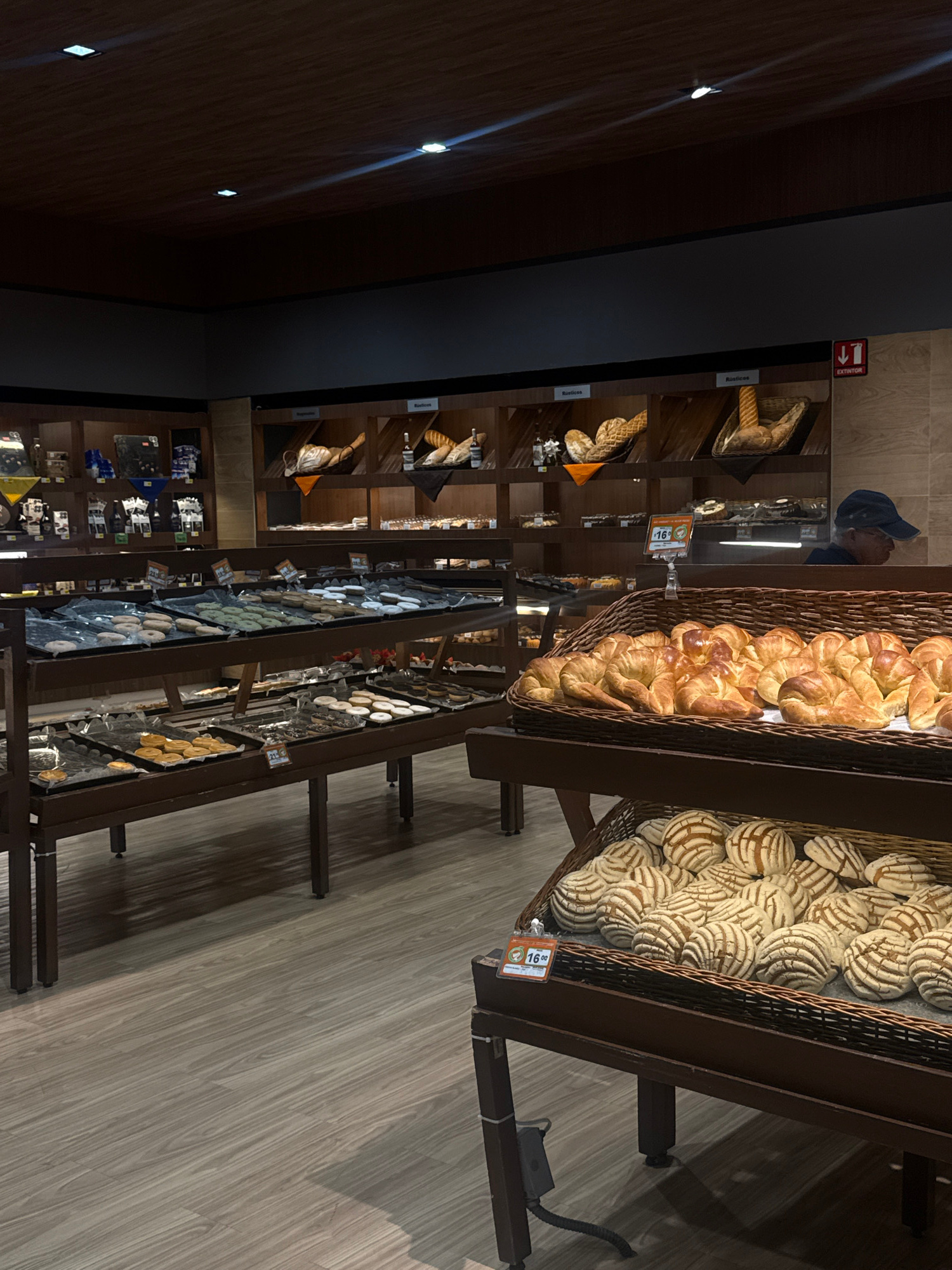 The image shows an interior view of a bakery, with a variety of baked goods on display. At the forefront are large baskets filled with pastries, including croissants and conchas (a type of Mexican swe…read more