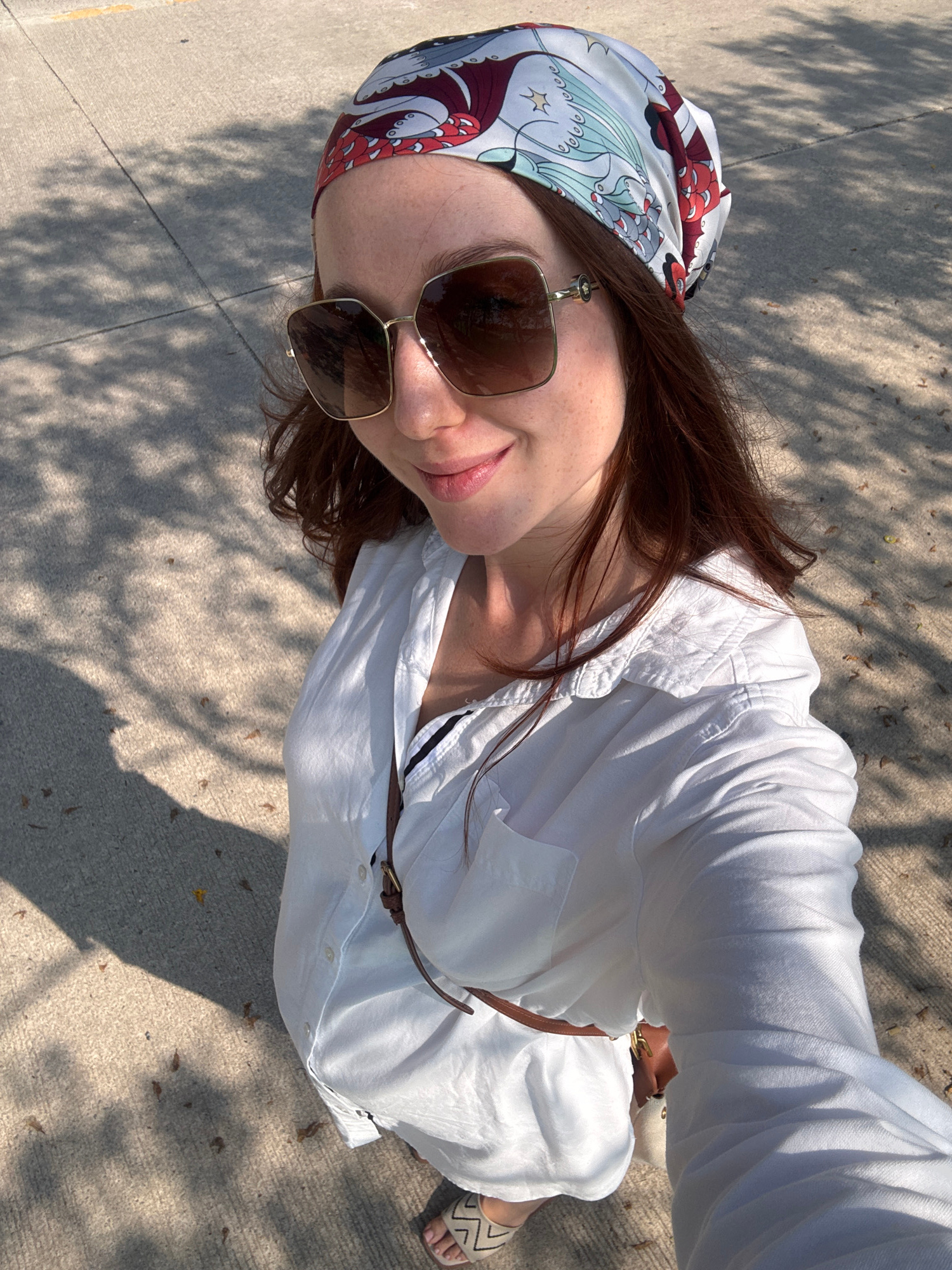 An overhead, slightly tilted view captures a person, likely a woman, outdoors on a sunny day. She looks upwards with a subtle smile. Her head is covered with a stylish headscarf in light blue, red, wh…read more